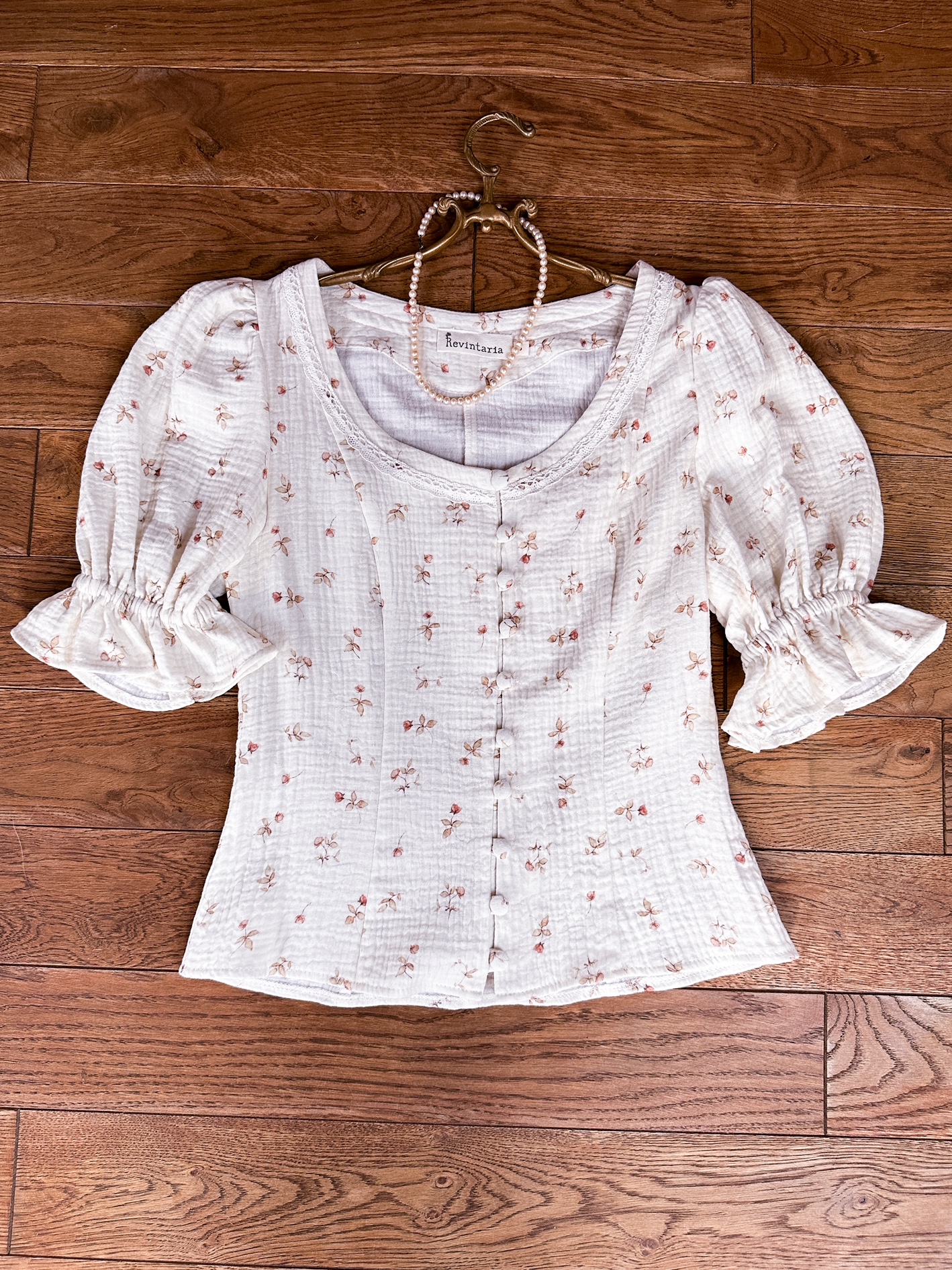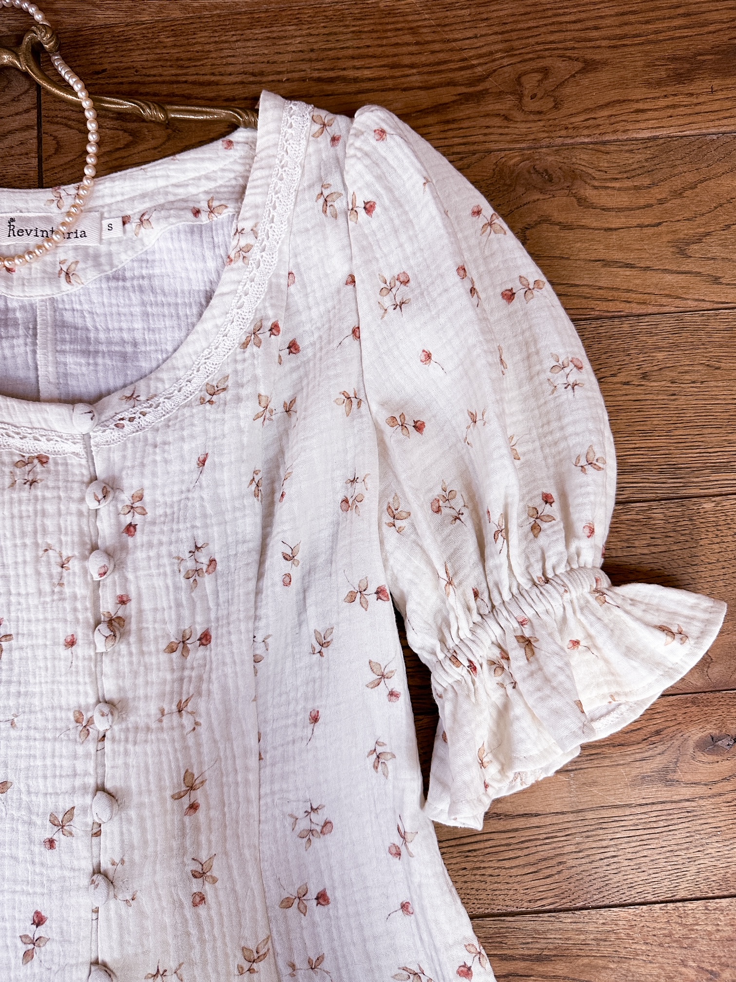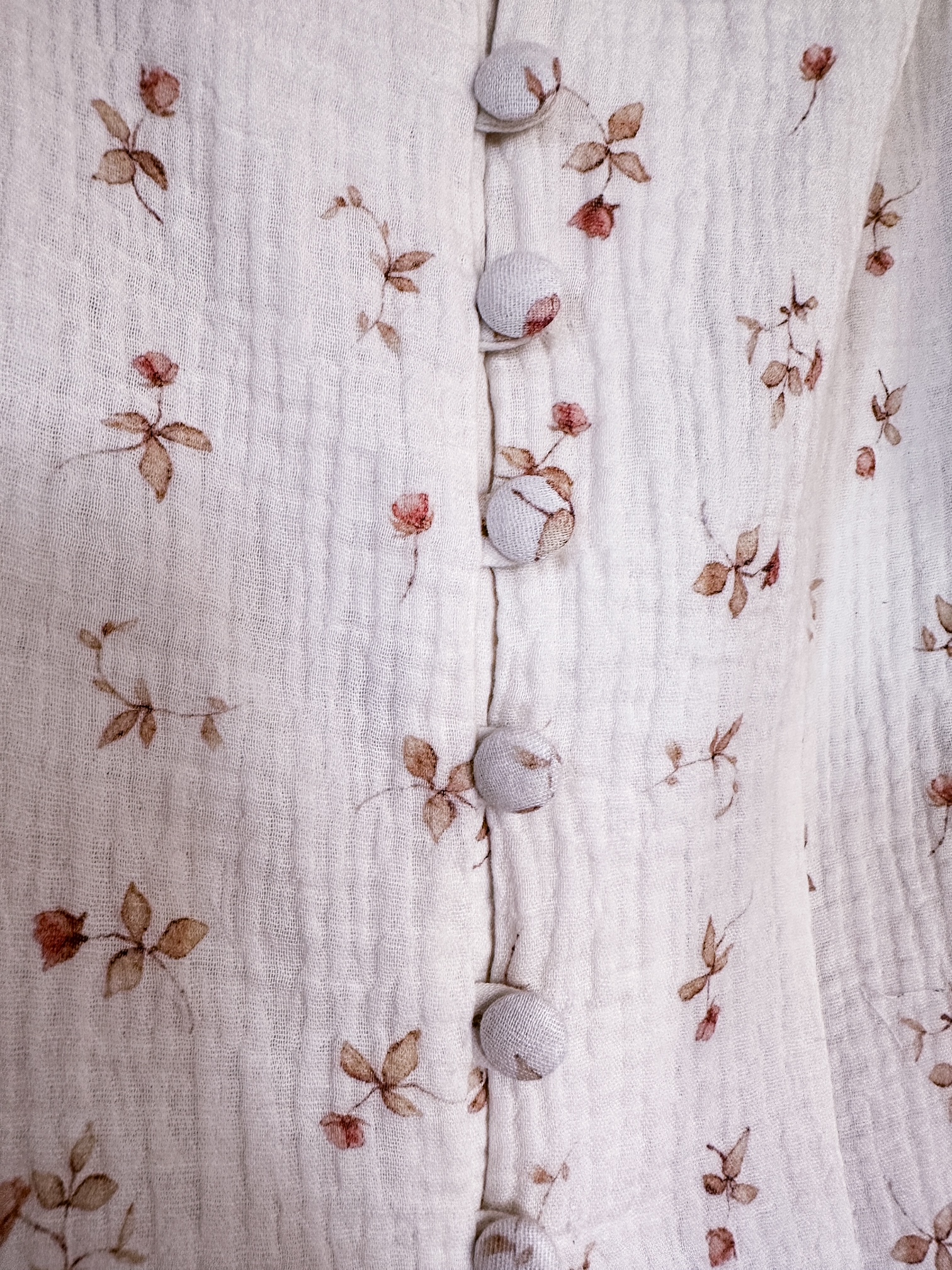 Cassandra has a delicate round neckline, beautifully puffed sleeves and hand covered buttons.