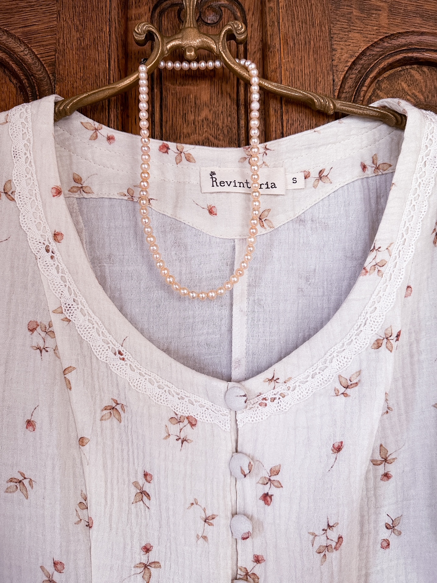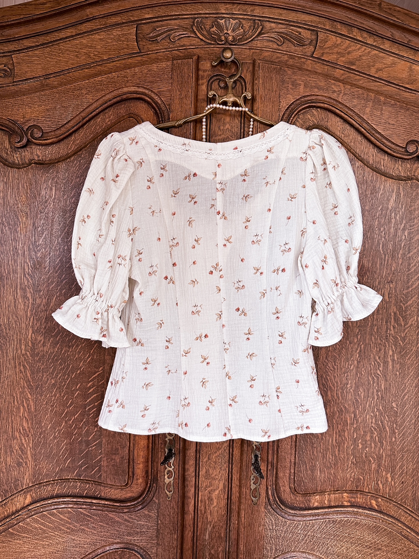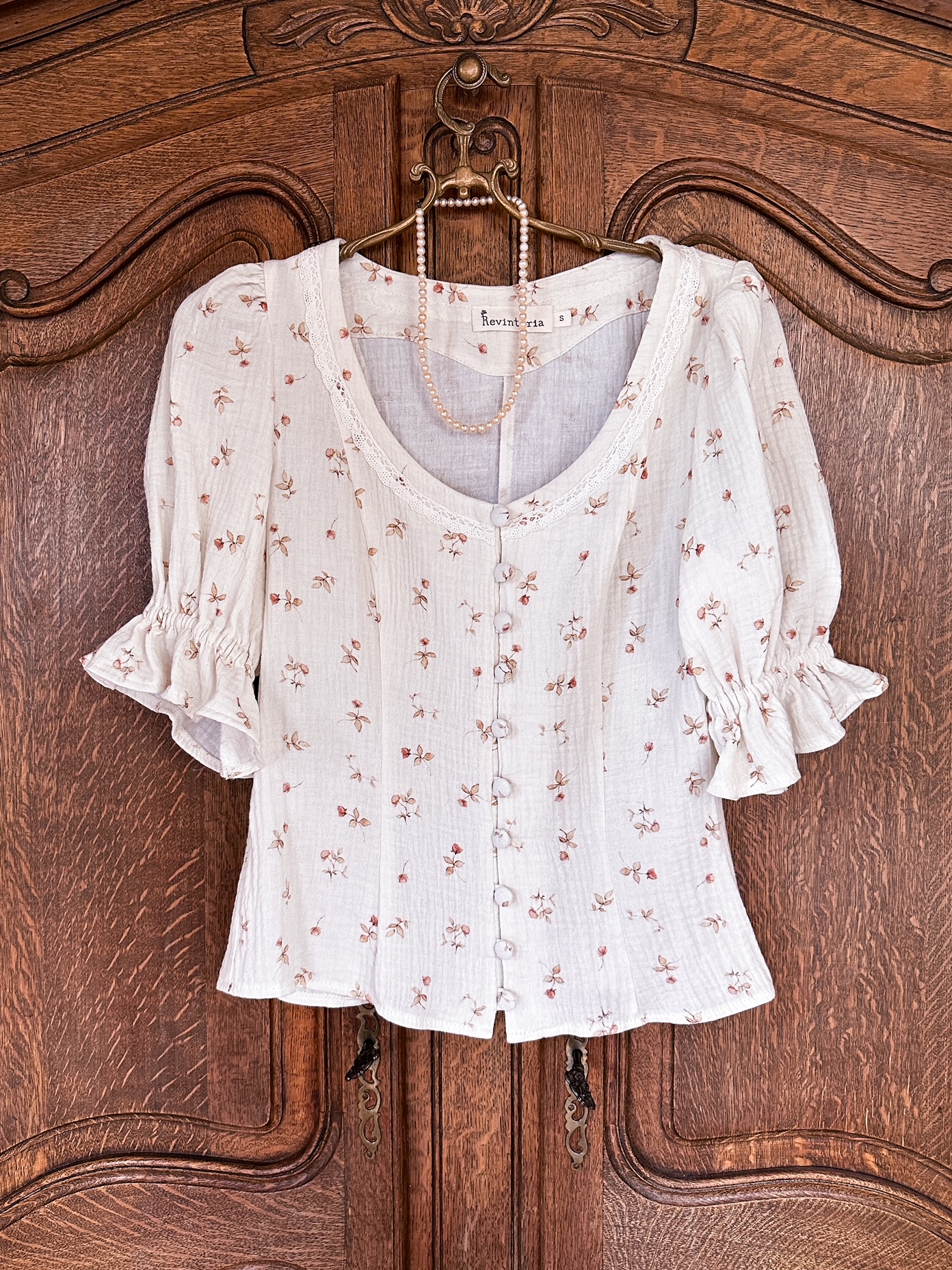 Cassandra has a delicate round neckline, beautifully puffed sleeves and hand covered buttons.