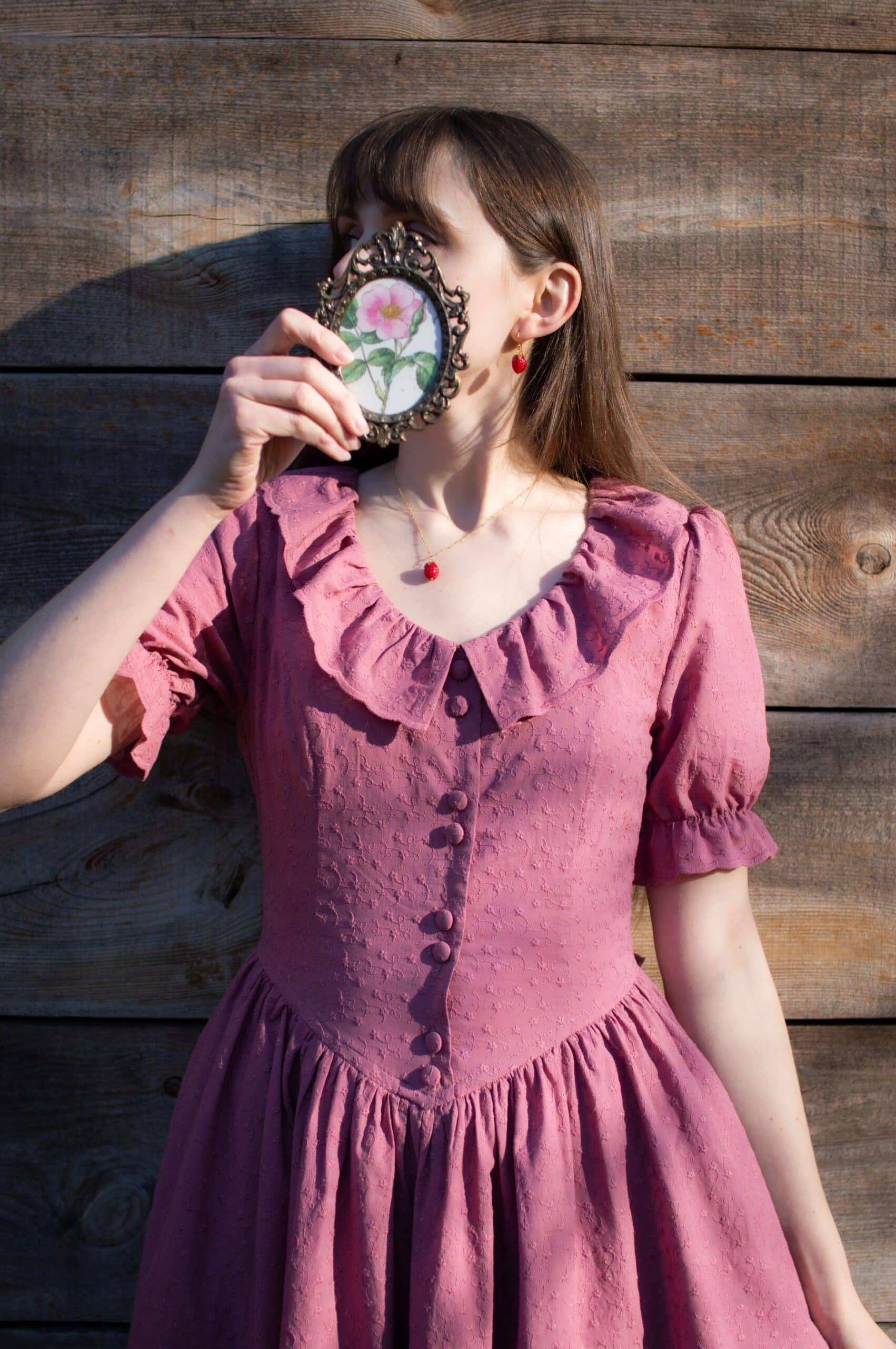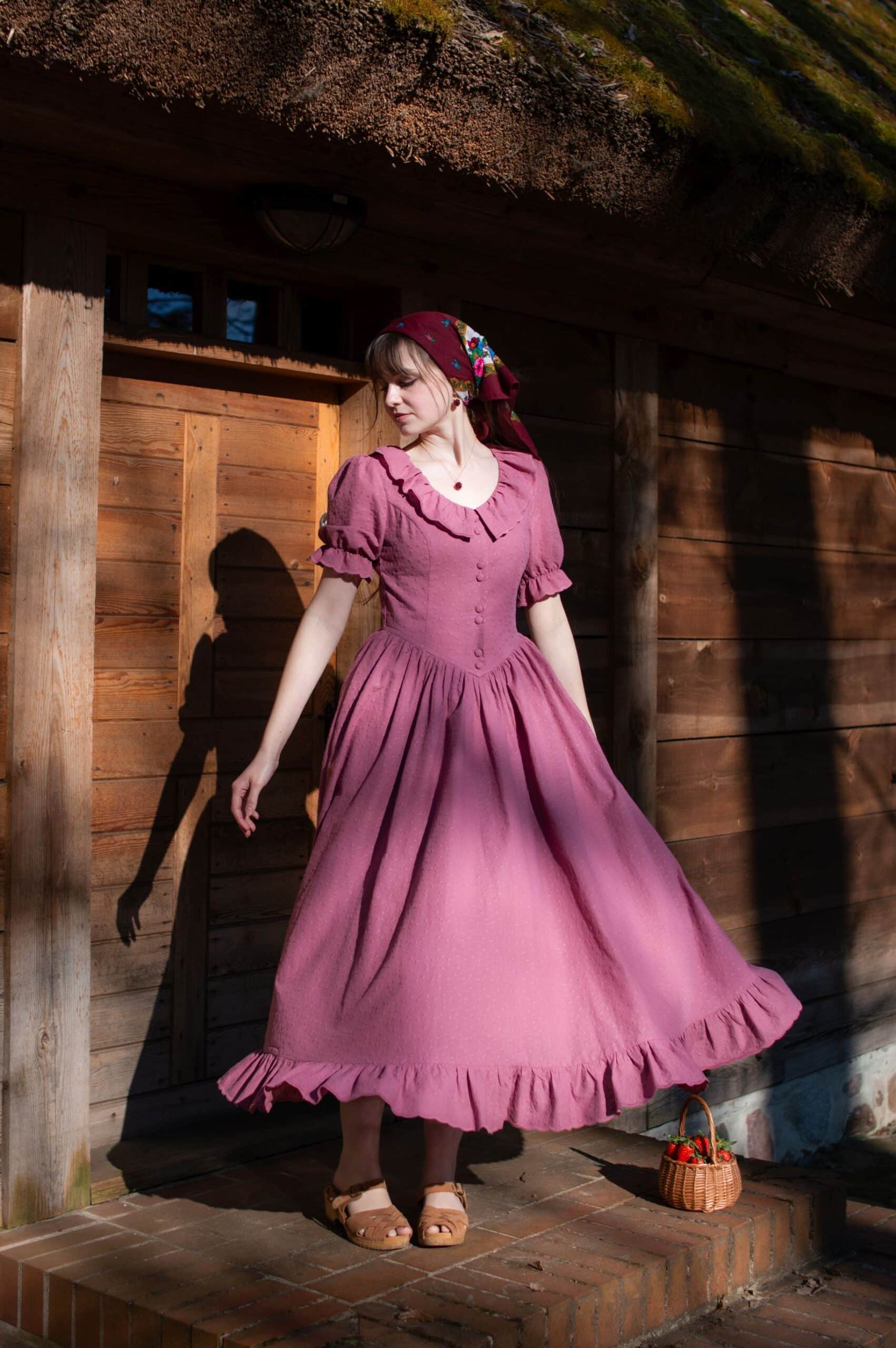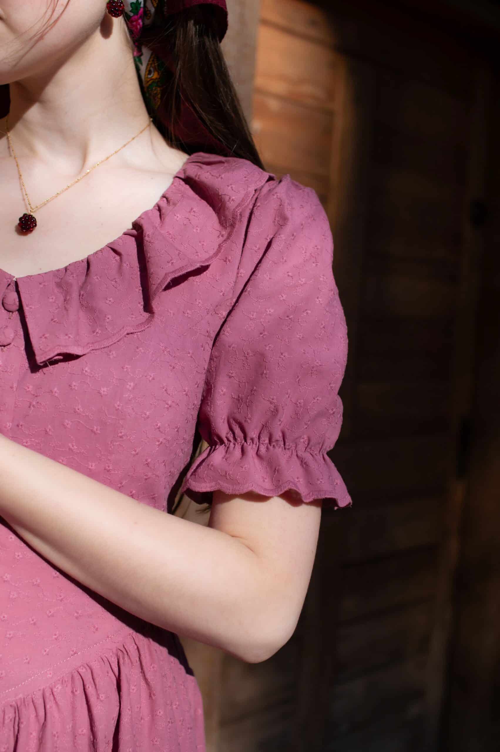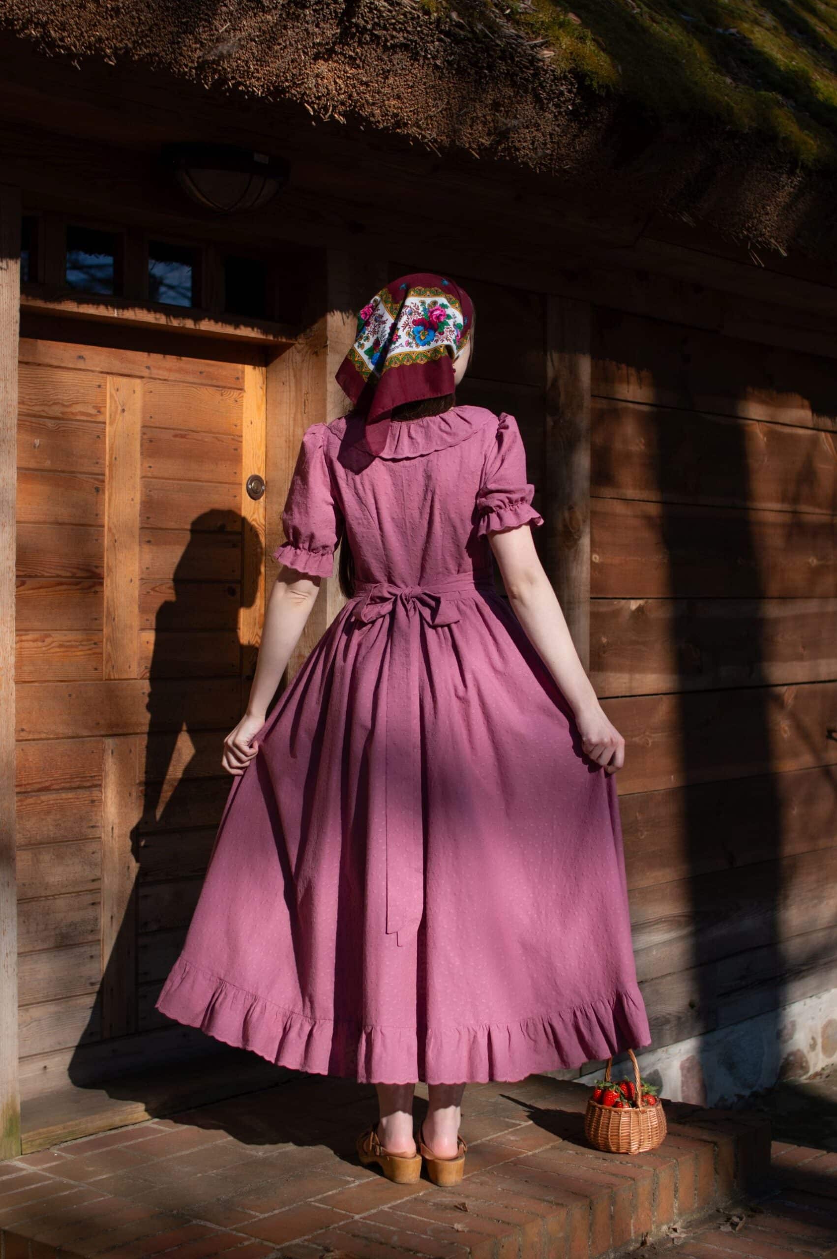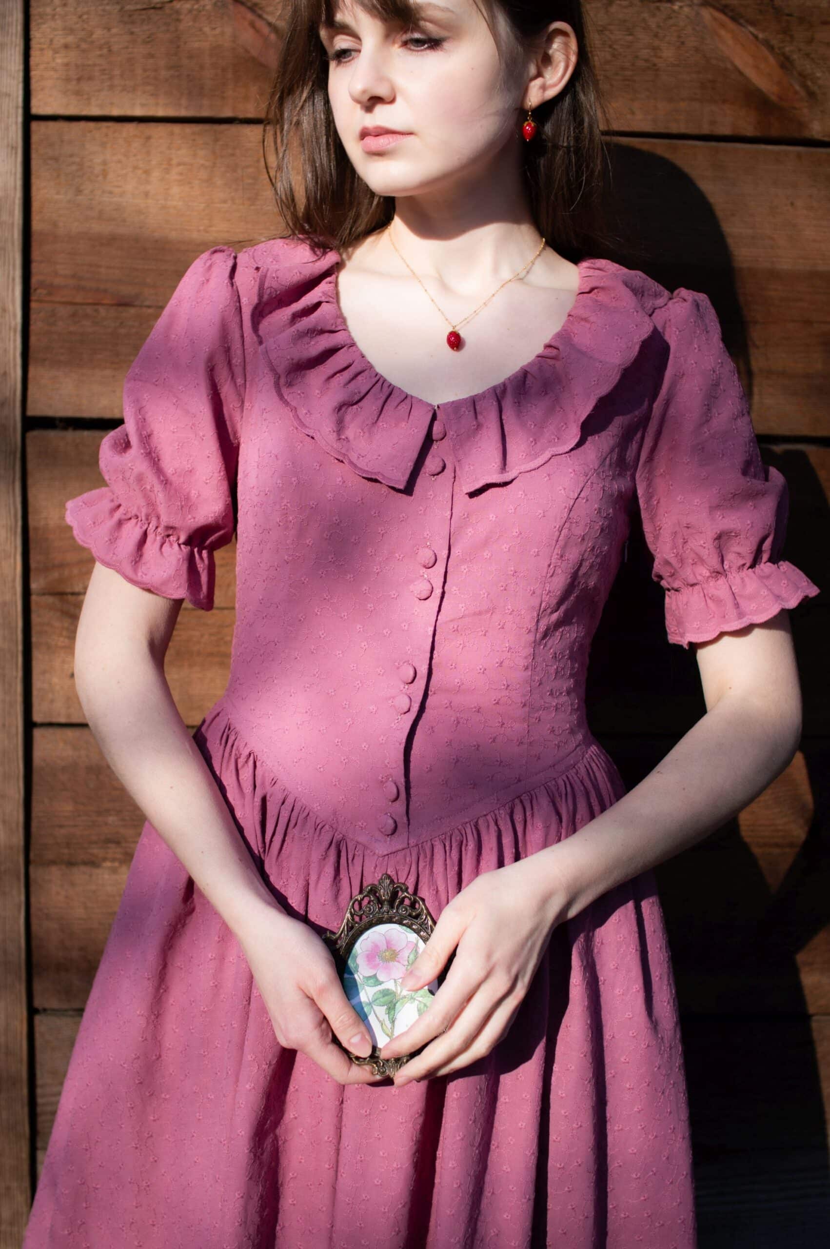 Madeleine is a vintage inspired tea length dress made of lightweight and delicate mauve cotton fabric decorated with subtle floral embroideries. The dress is full of eye catching details: round neckline with a scalloped ruffle collar, V-shaped waist, sewn in fabric ribbons that can be tied in the back. Madeleine has short puffed sleeves with scalloped ruffle cuffs and a ruffle hem. Close fitting bodice buttons up with hand covered buttons. The dress has cotton batiste lining in the skirt part, a side zipper and two side-seam pockets to fit your essentials.