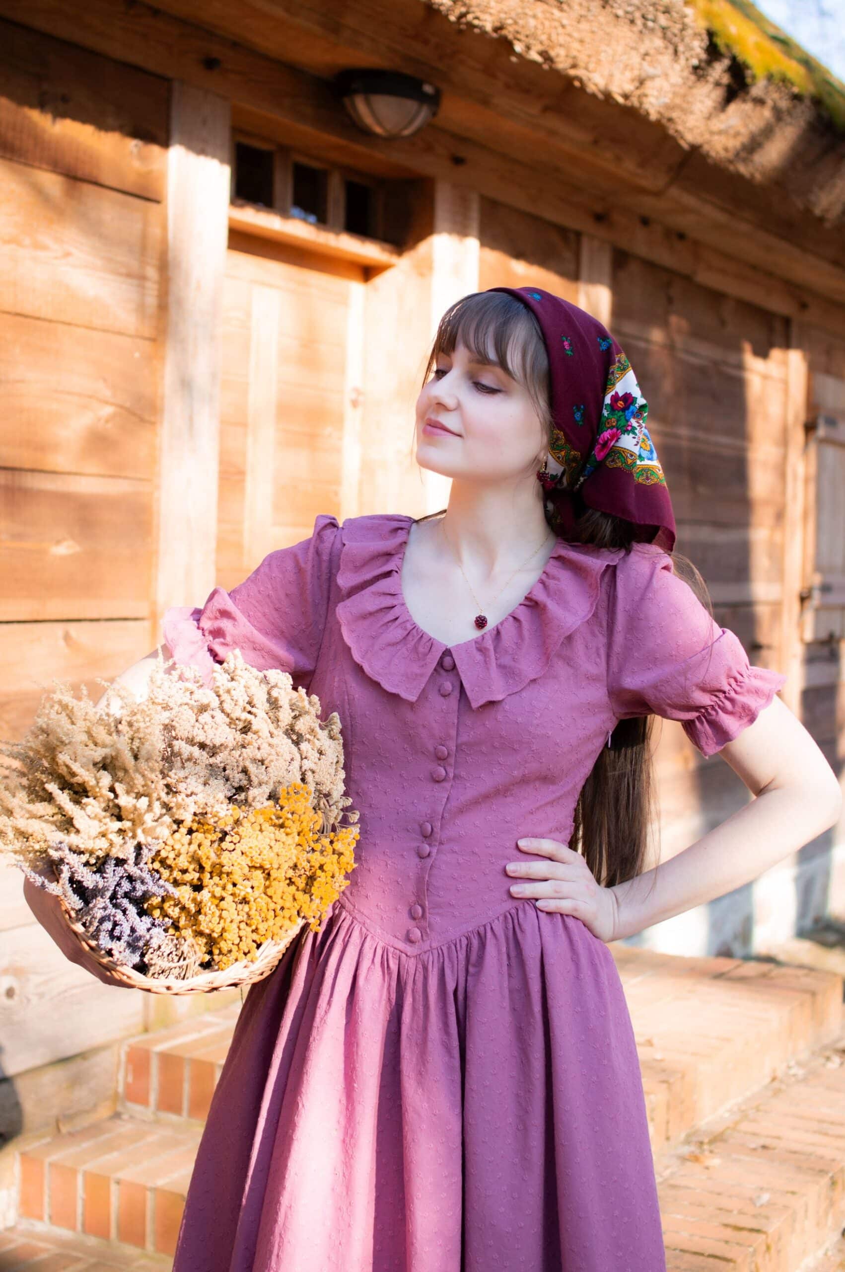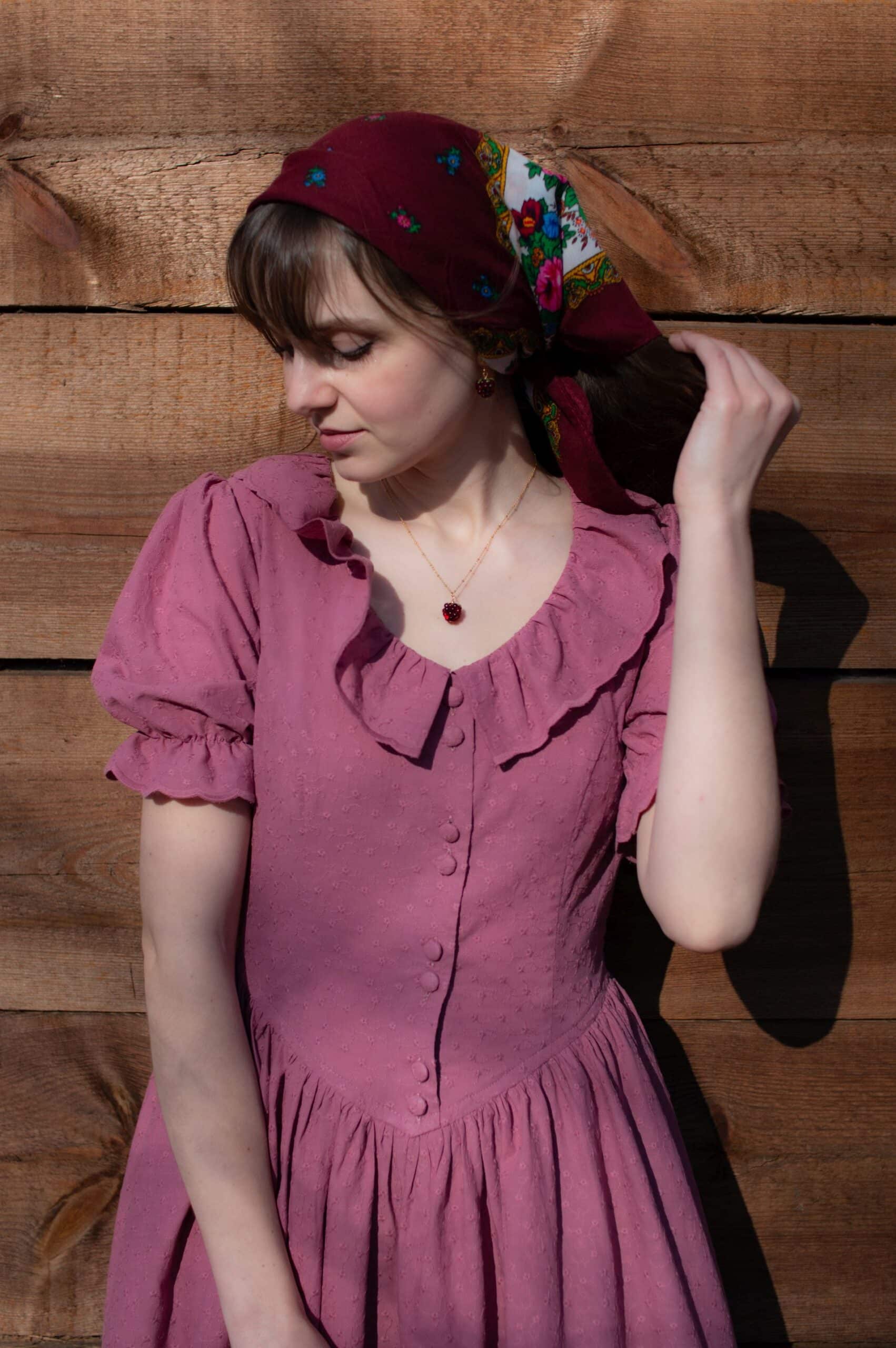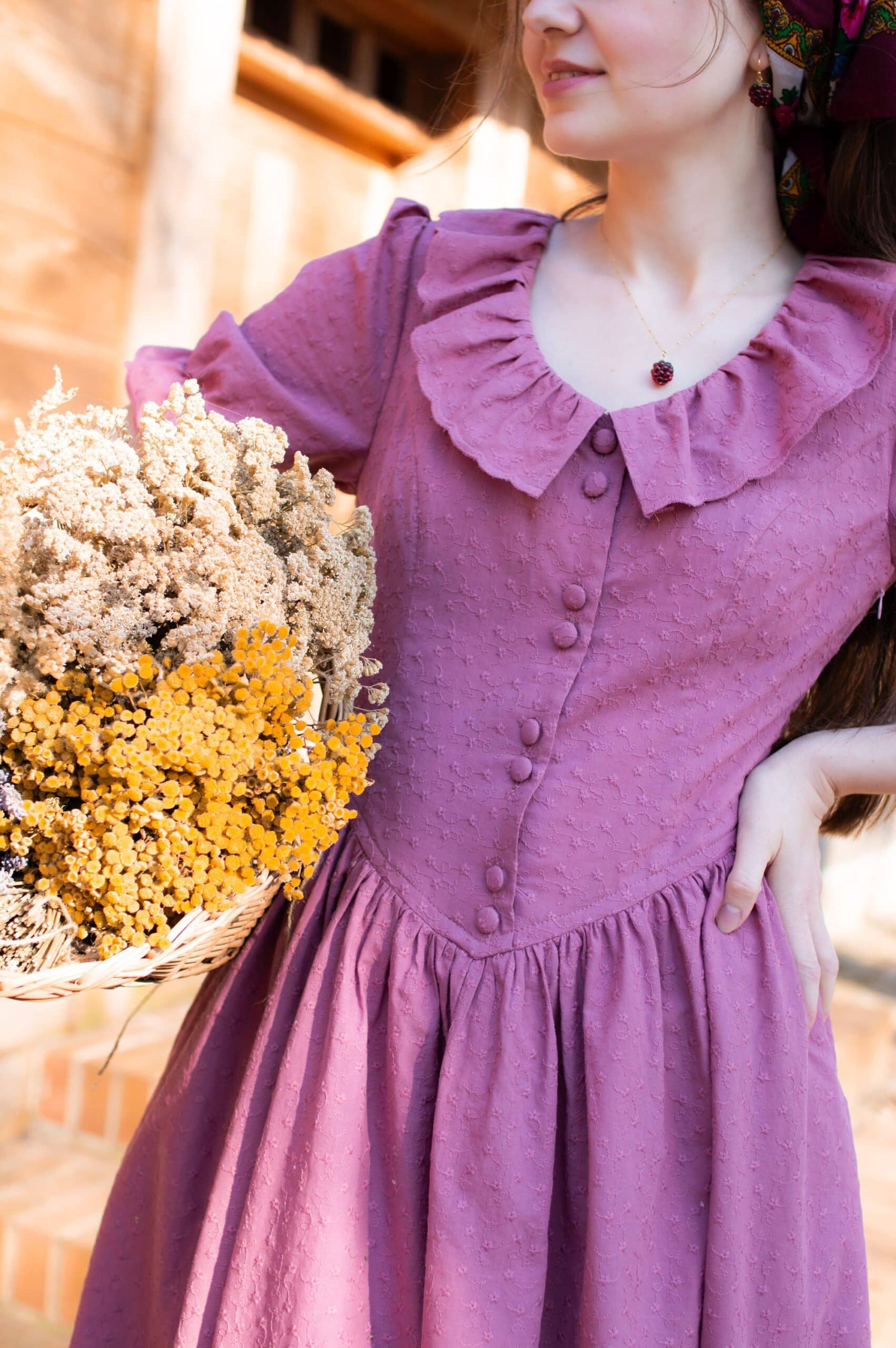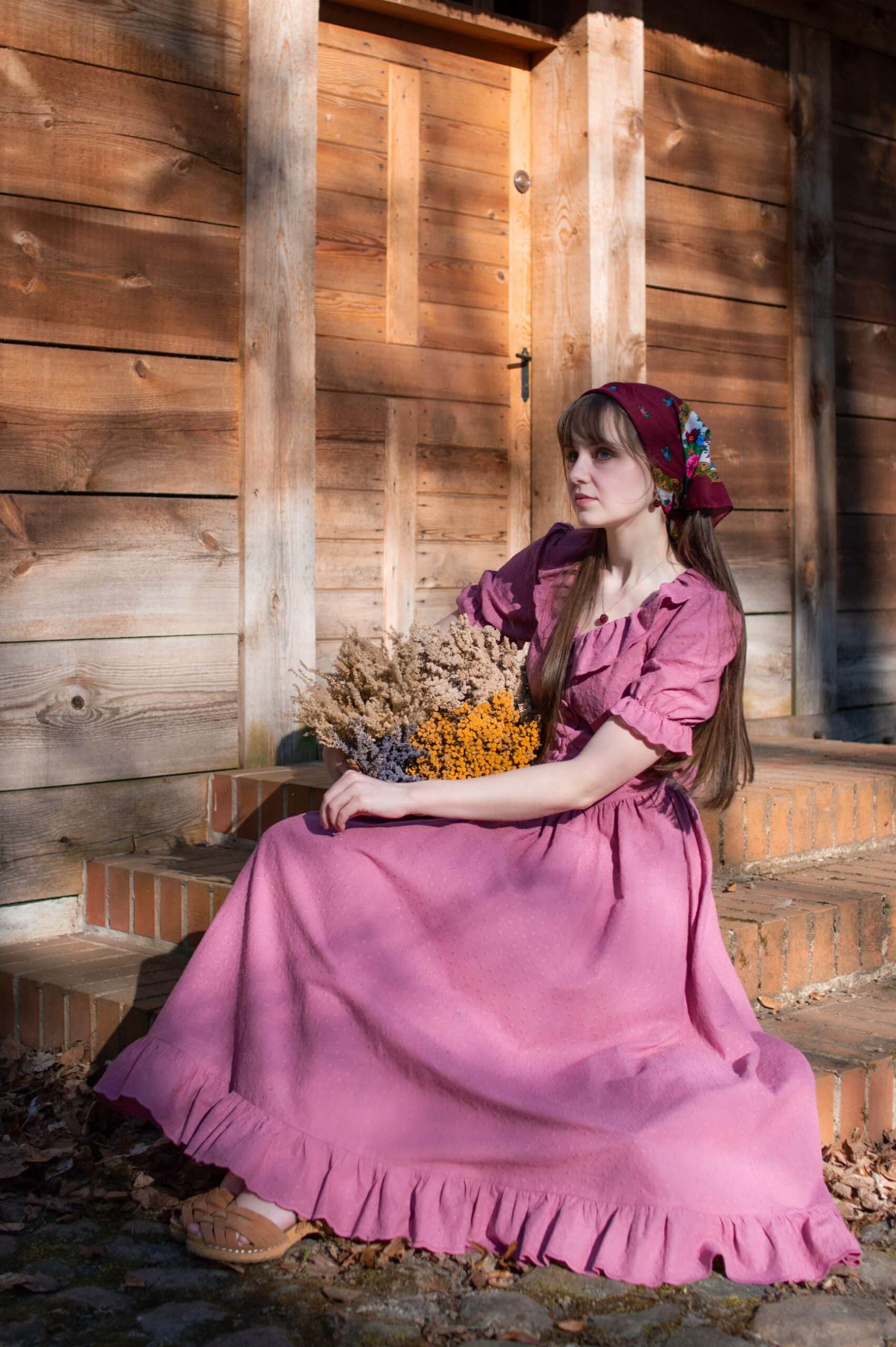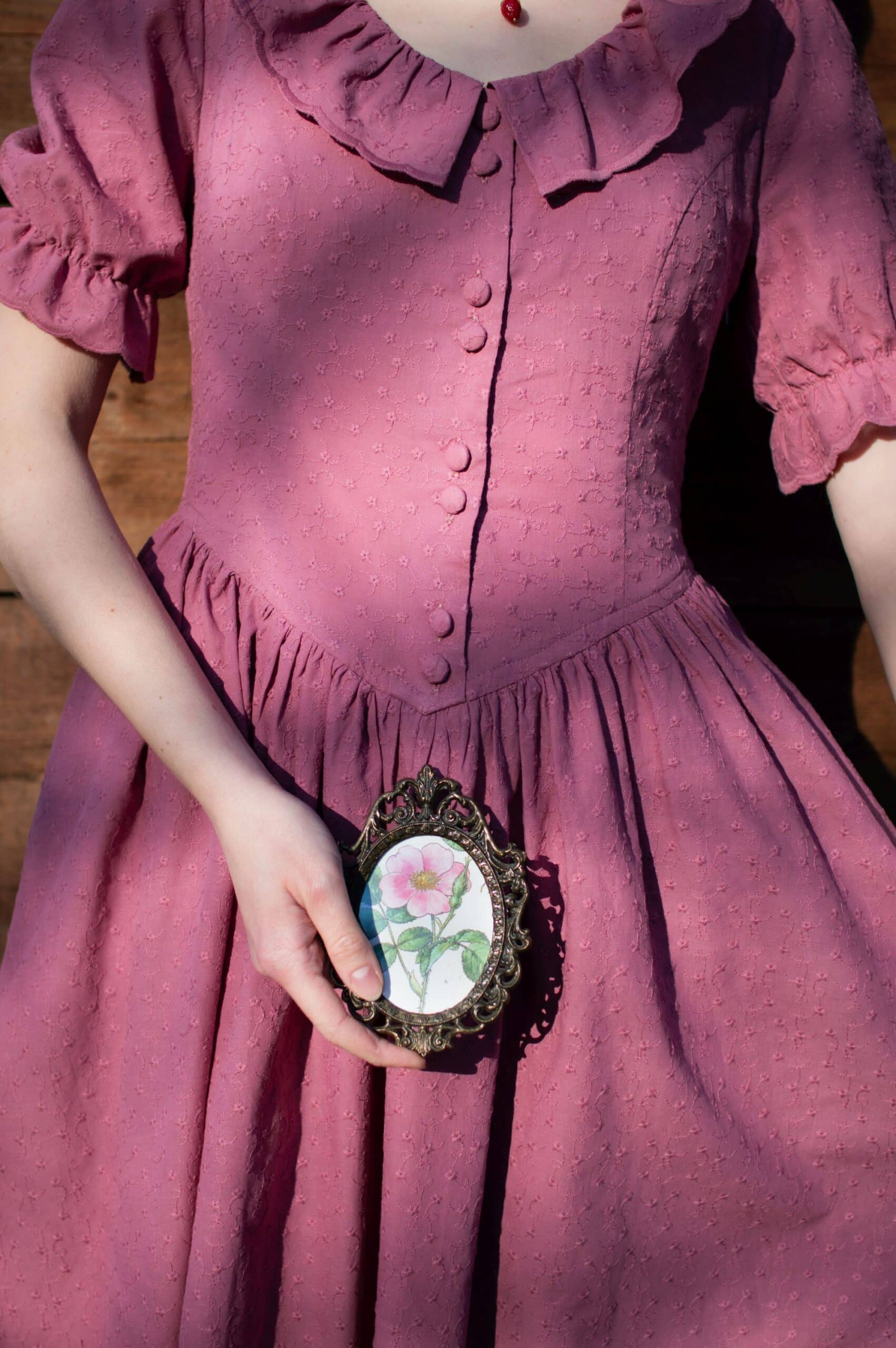 Madeleine is a vintage inspired tea length dress made of lightweight and delicate mauve cotton fabric decorated with subtle floral embroideries. The dress is full of eye catching details: round neckline with a scalloped ruffle collar, V-shaped waist, sewn in fabric ribbons that can be tied in the back. Madeleine has short puffed sleeves with scalloped ruffle cuffs and a ruffle hem. Close fitting bodice buttons up with hand covered buttons. The dress has cotton batiste lining in the skirt part, a side zipper and two side-seam pockets to fit your essentials.