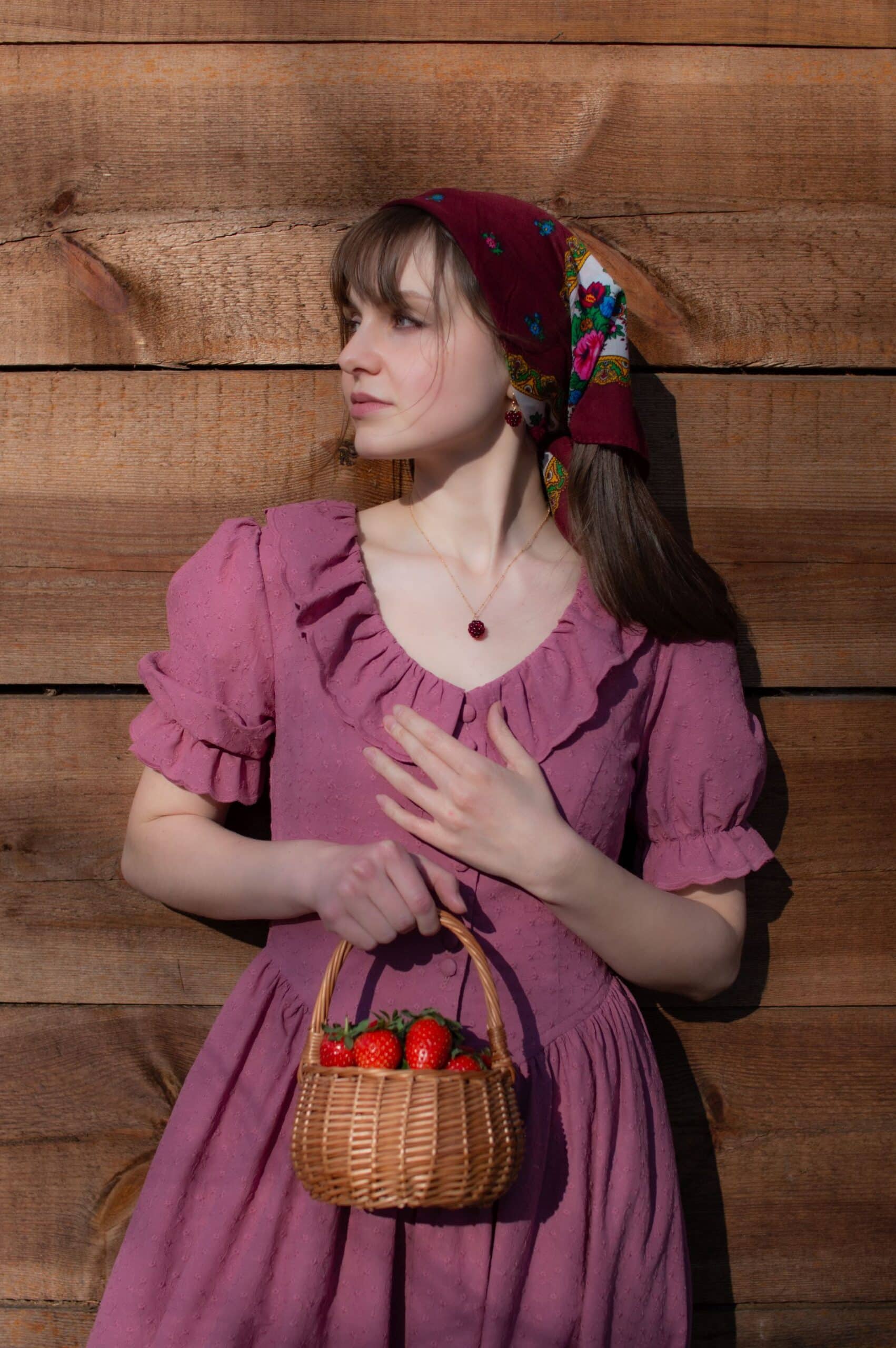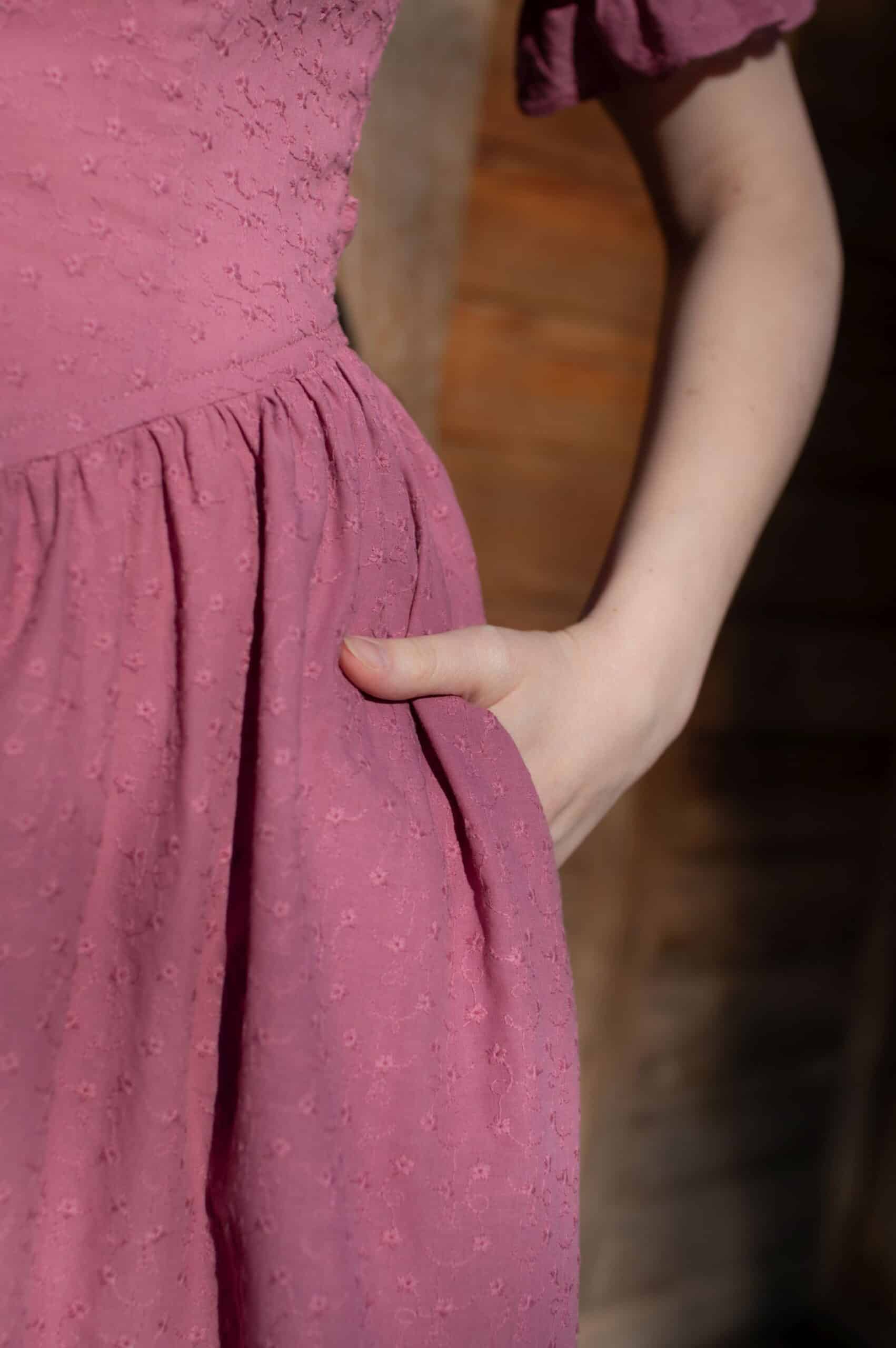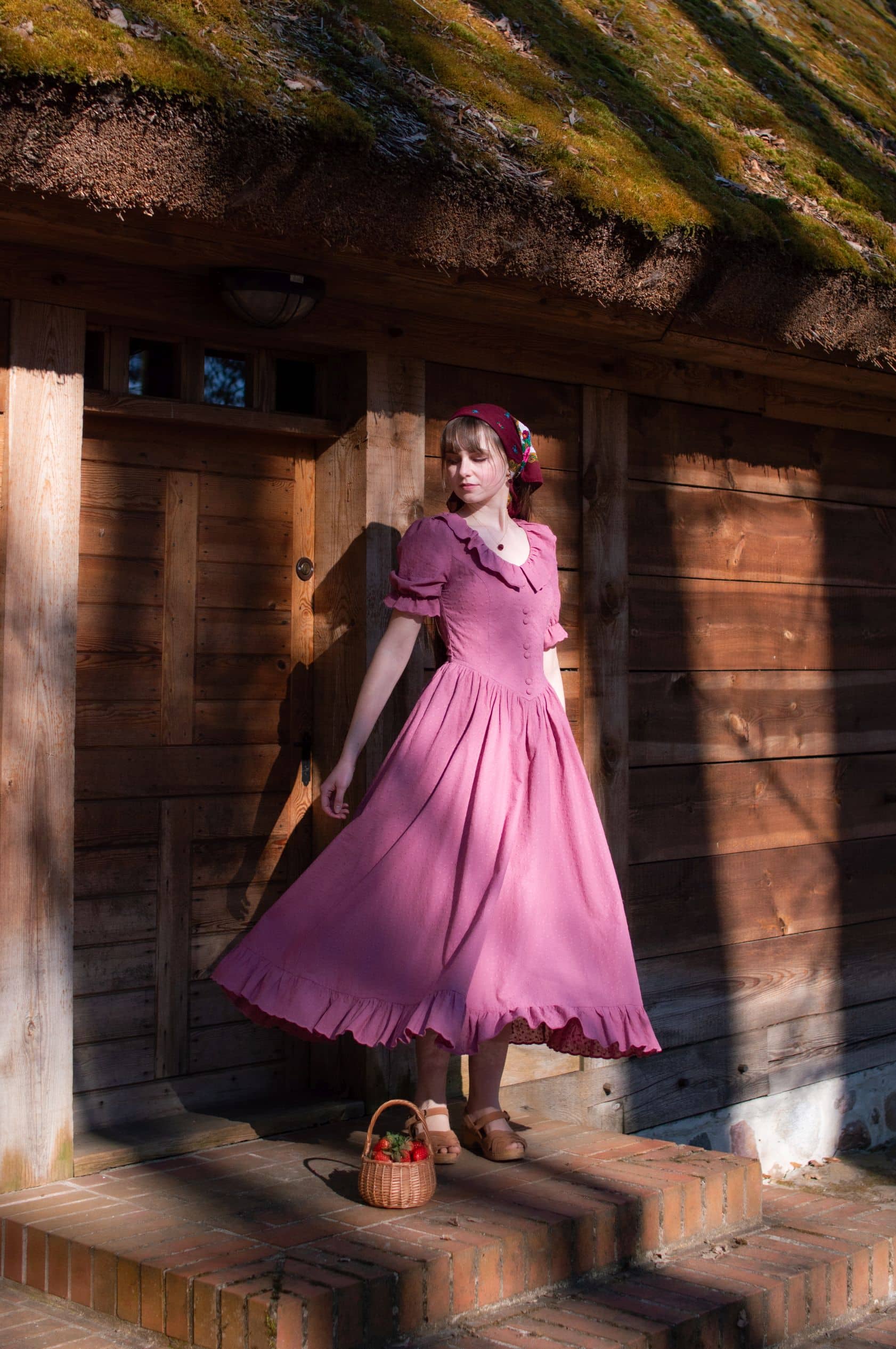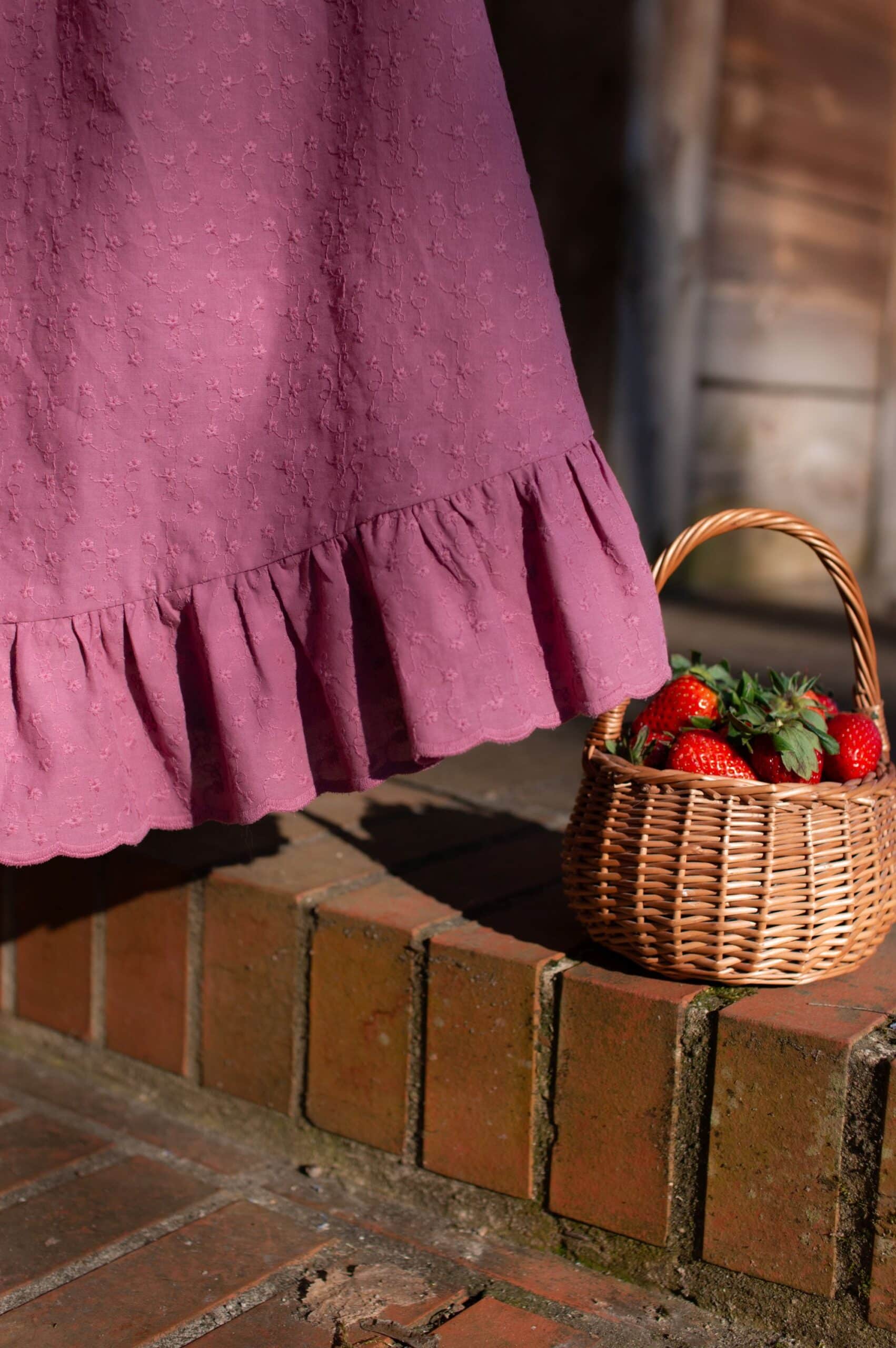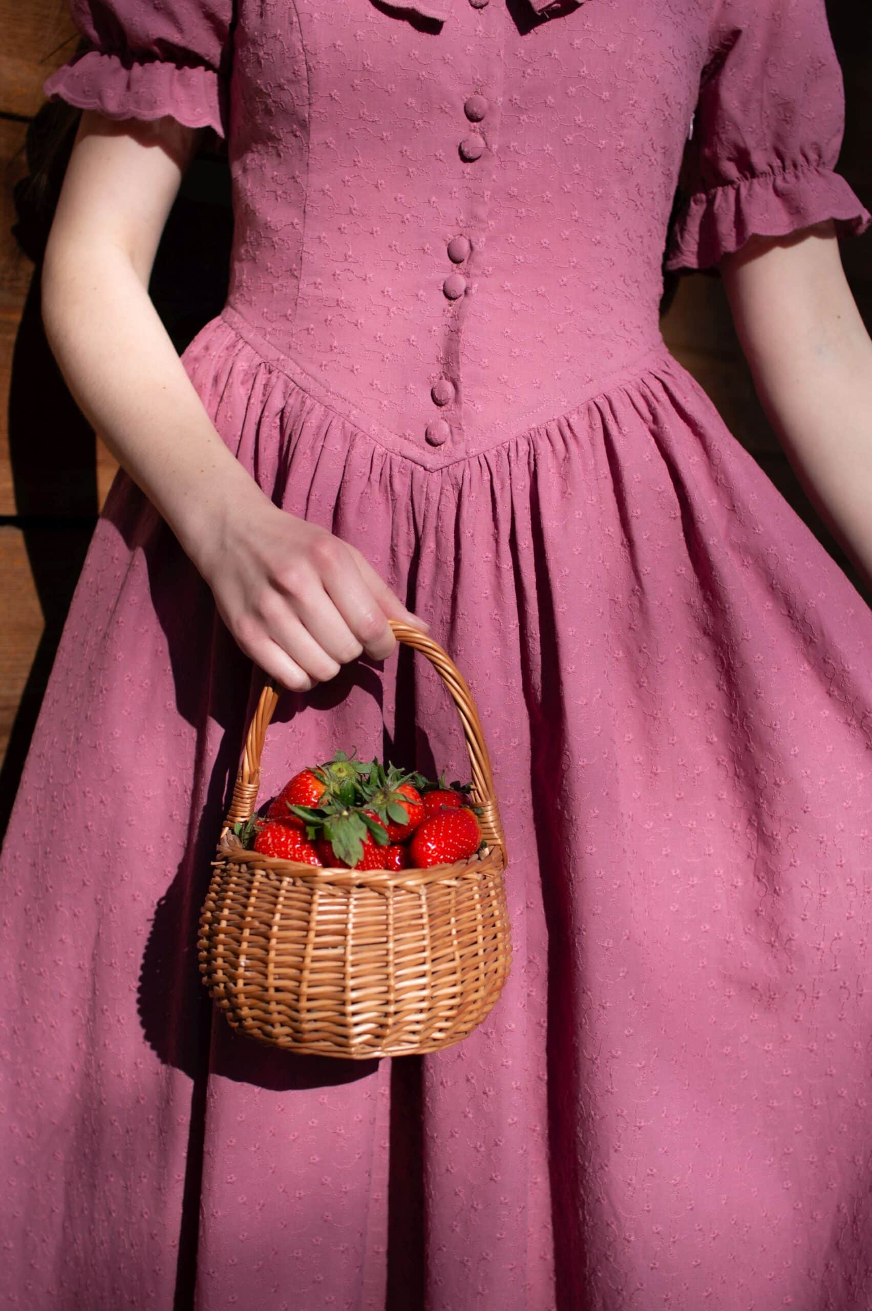Madeleine is a vintage inspired tea length dress made of lightweight and delicate mauve cotton fabric decorated with subtle floral embroideries. The dress is full of eye catching details: round neckline with a scalloped ruffle collar, V-shaped waist, sewn in fabric ribbons that can be tied in the back. Madeleine has short puffed sleeves with scalloped ruffle cuffs and a ruffle hem. Close fitting bodice buttons up with hand covered buttons. The dress has cotton batiste lining in the skirt part, a side zipper and two side-seam pockets to fit your essentials.