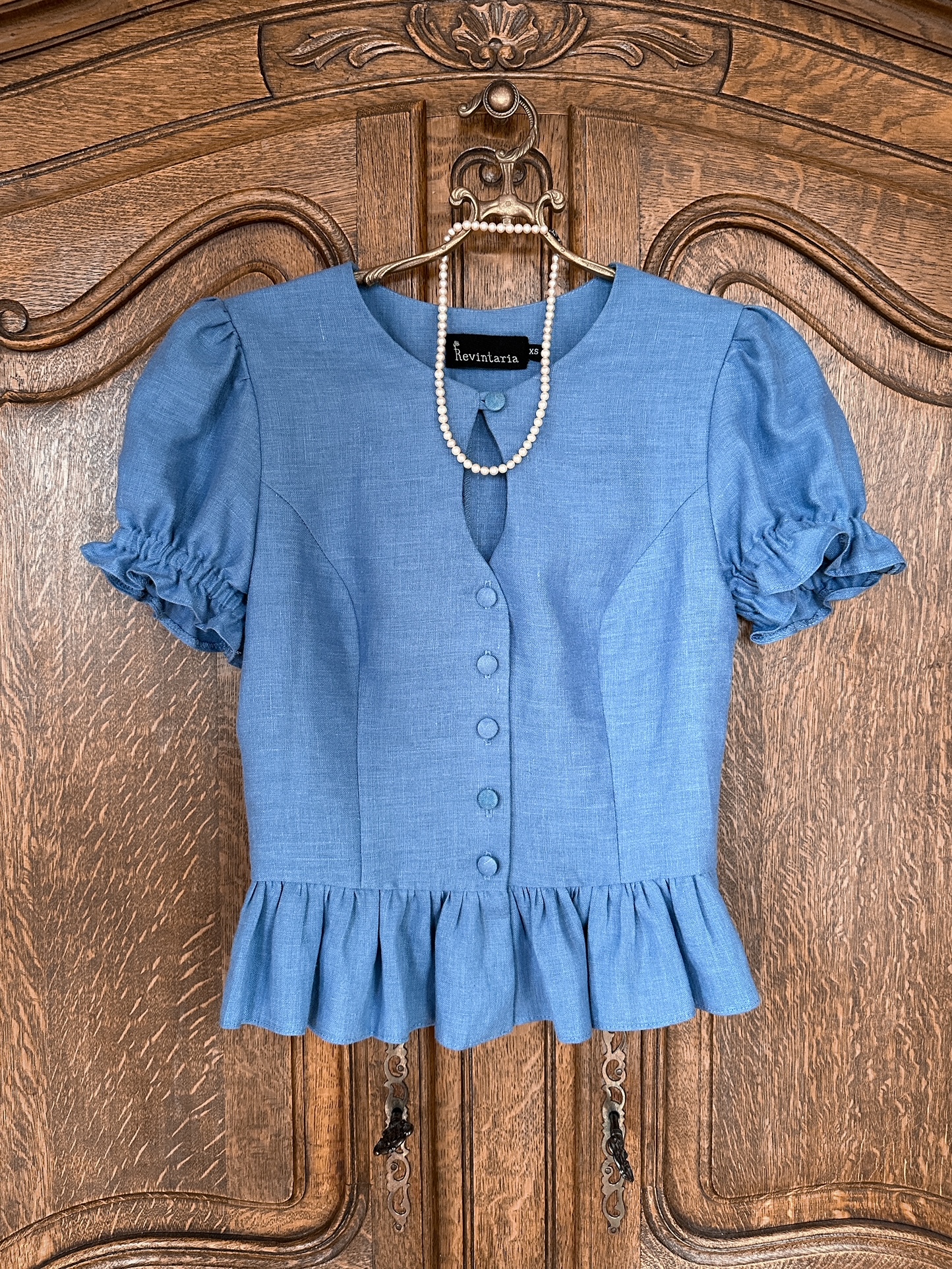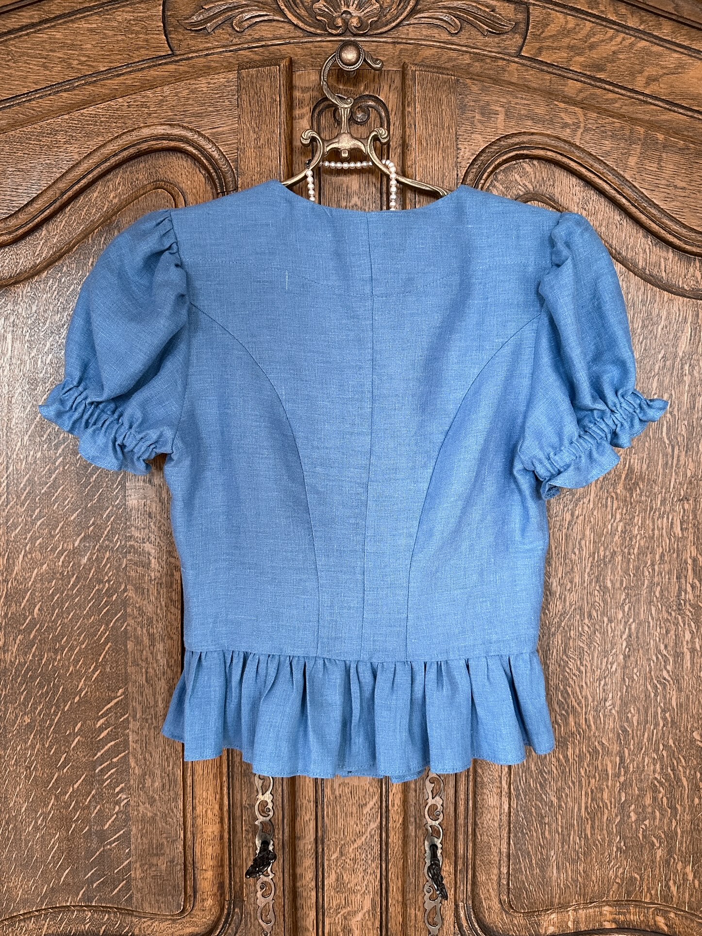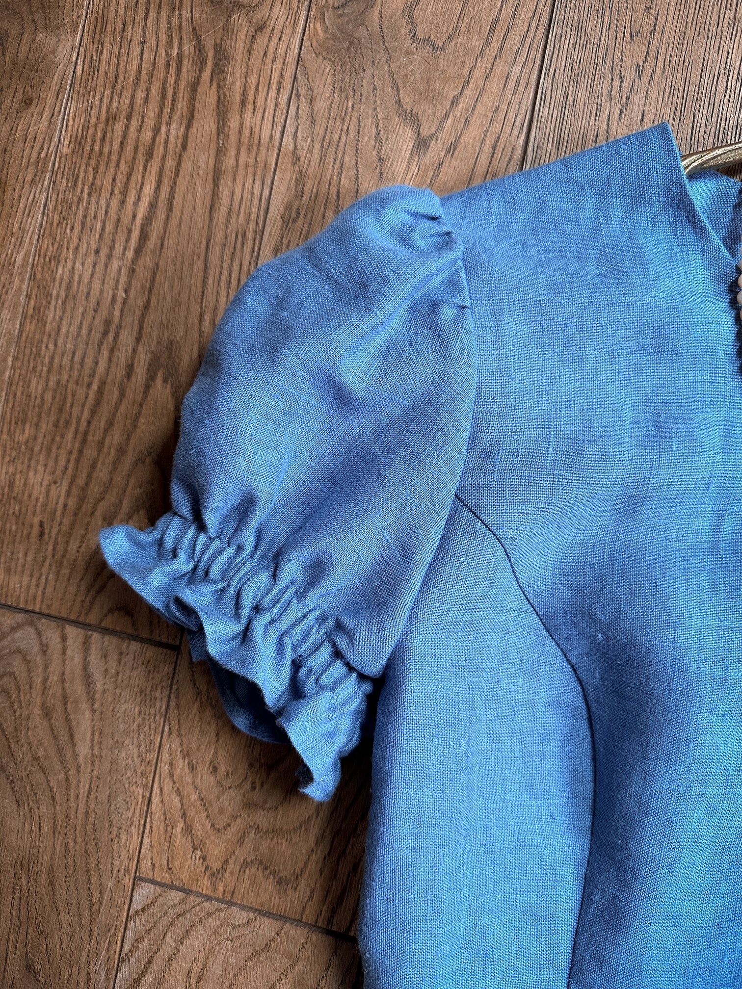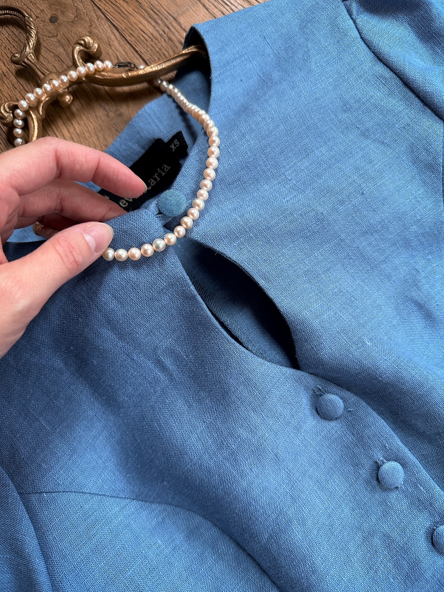 Morgana blouse made of soft dusty blue linen. Available in size XS. Here you can see more photos of the blouse in the original fabric: