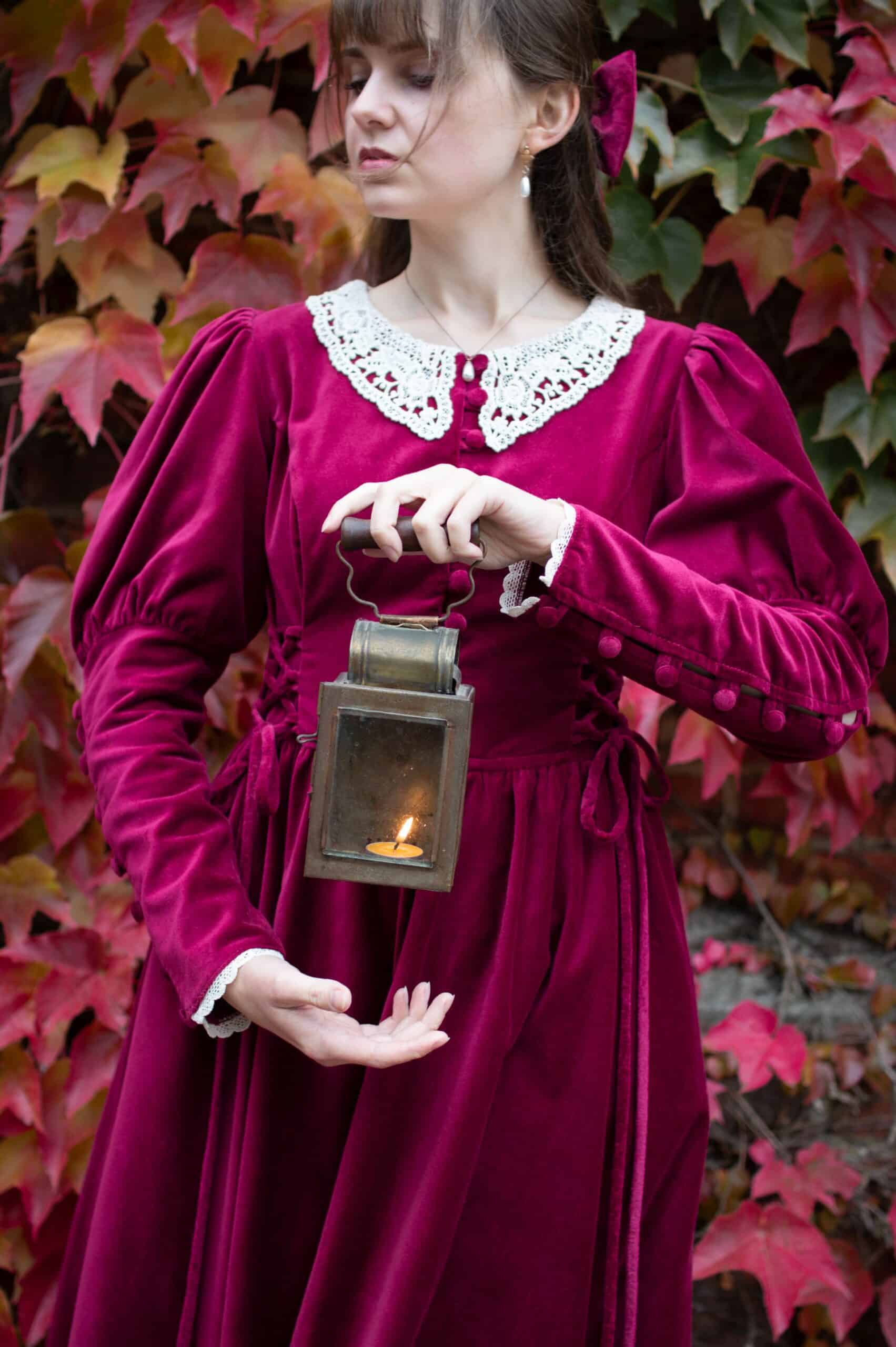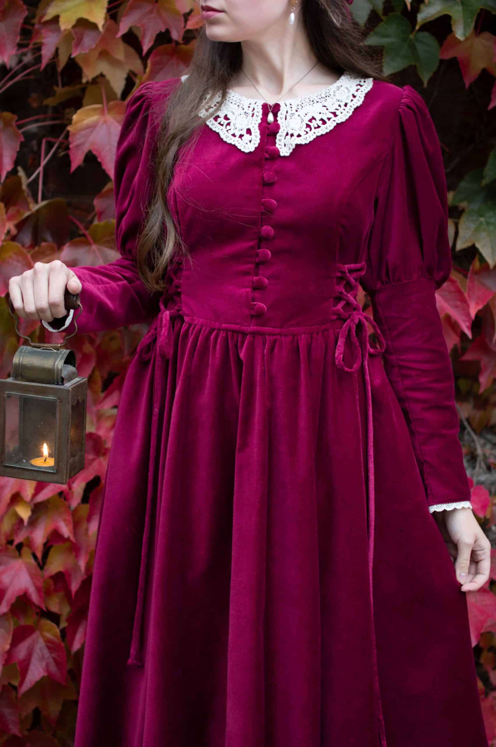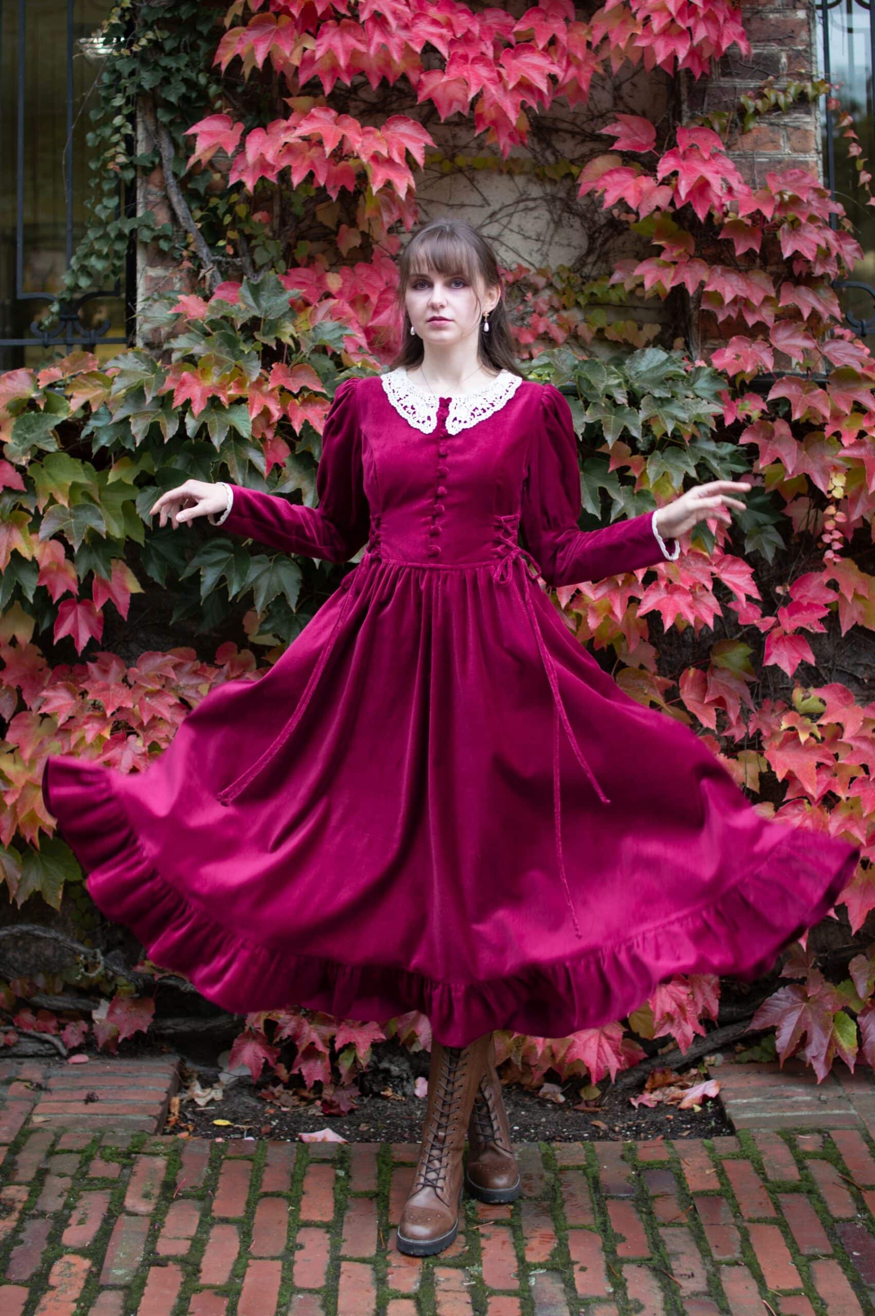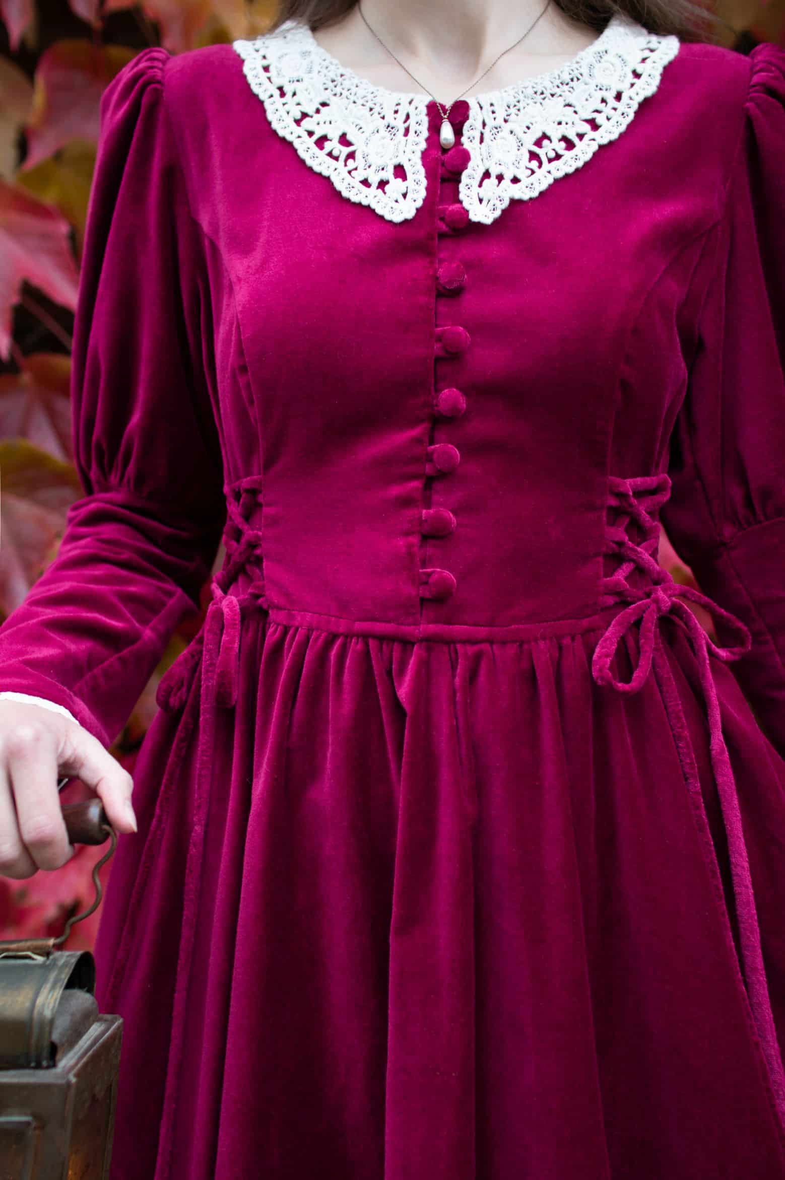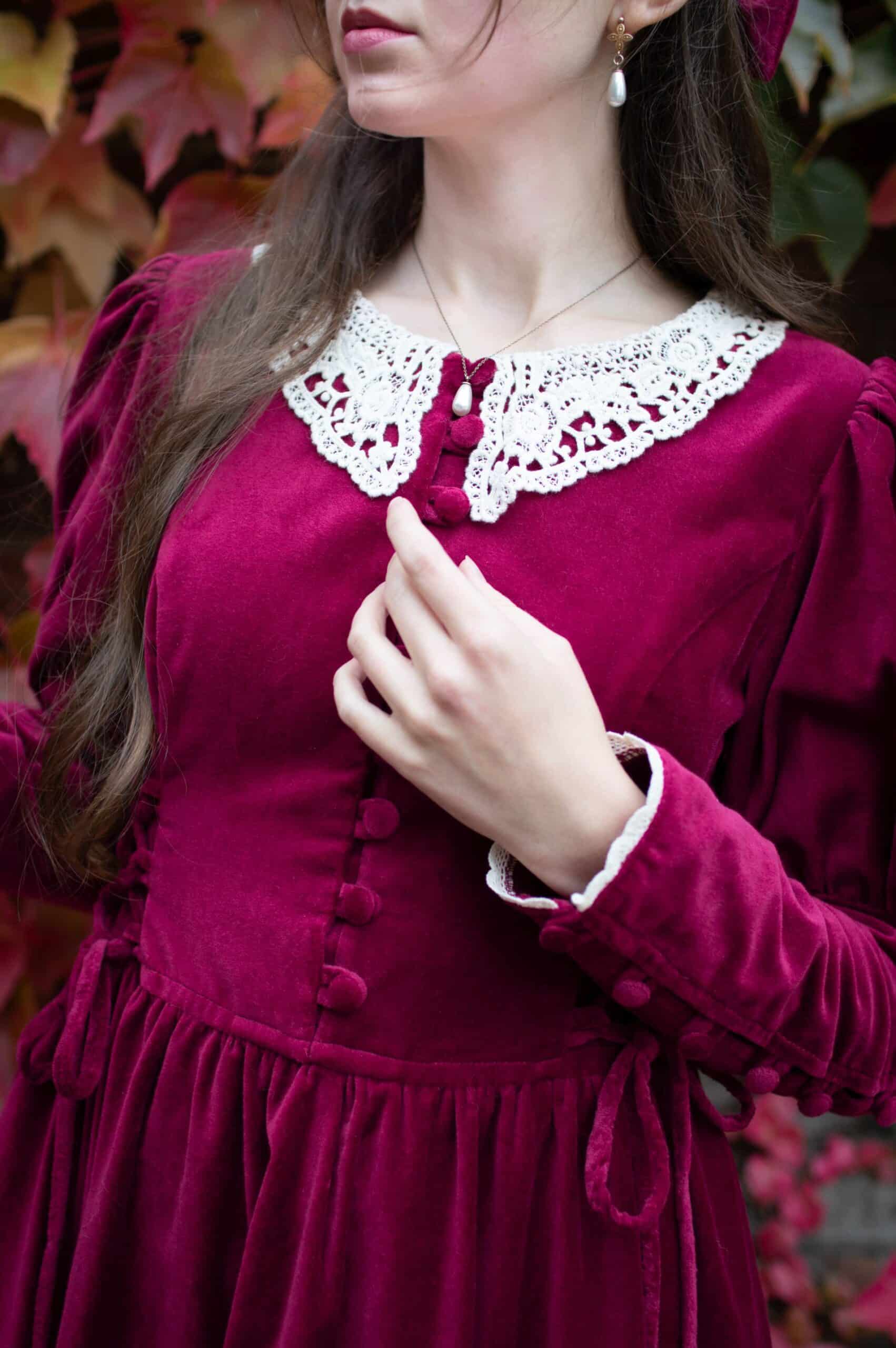 Scarlett is a vintage inspired midi dress made of rich burgundy cotton velvet. Full of eye catching details: delicate round neckline embellished with off white lace cotton collar, gathered waist adjustable with lacing on both sides, ruffle hem, long Juliet sleeves with button details and cotton lace trimmings. Scarlett has a side zipper and two side-seam pockets to fit your essentials. Close fitting bodice buttons up with hand covered buttons. Scarlett’s skirt is full and twirls beautifully when moving around.