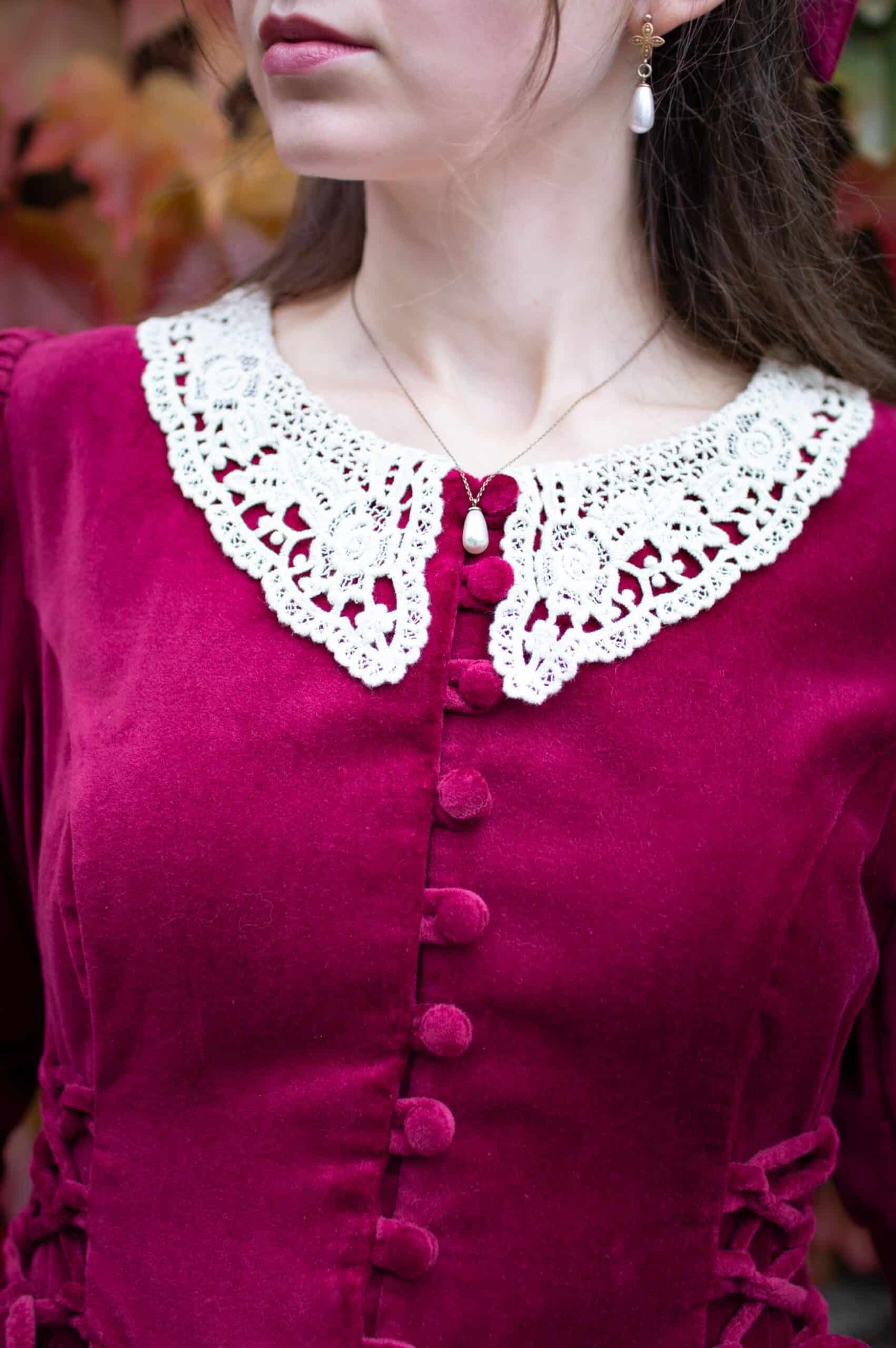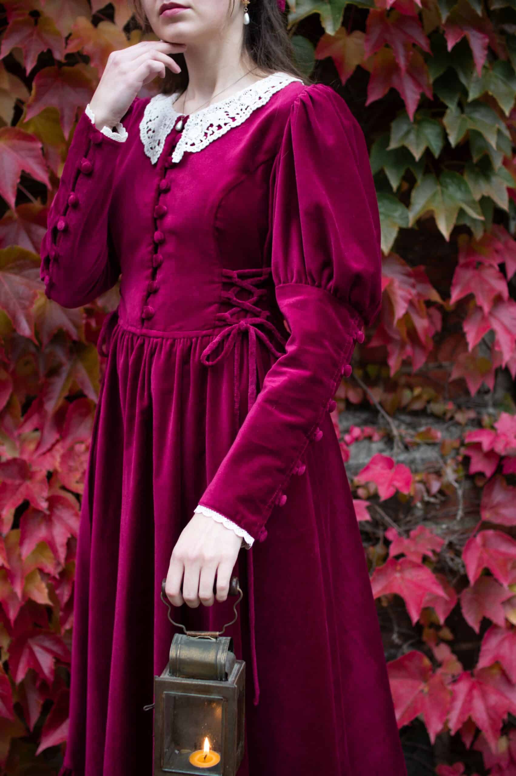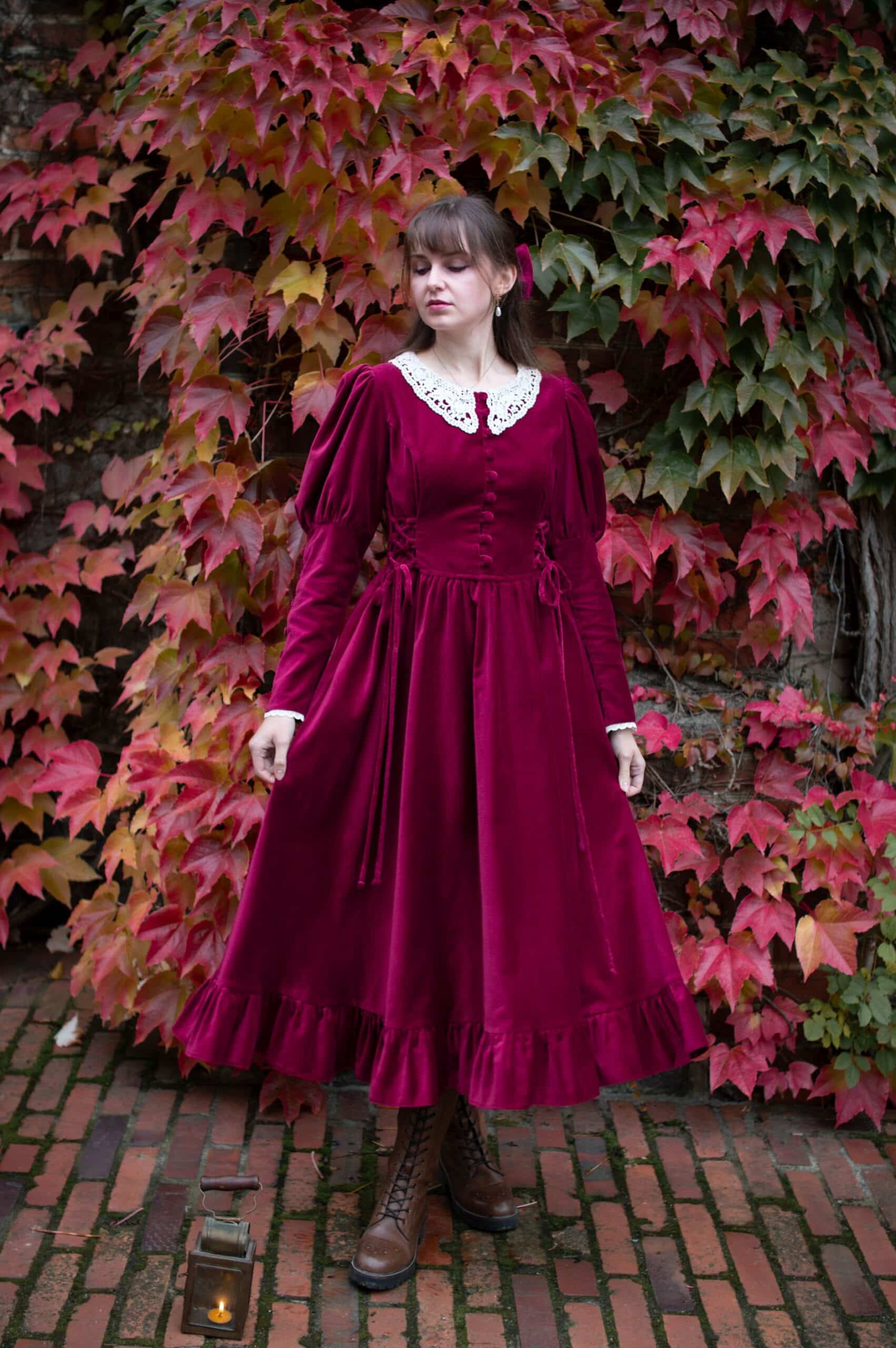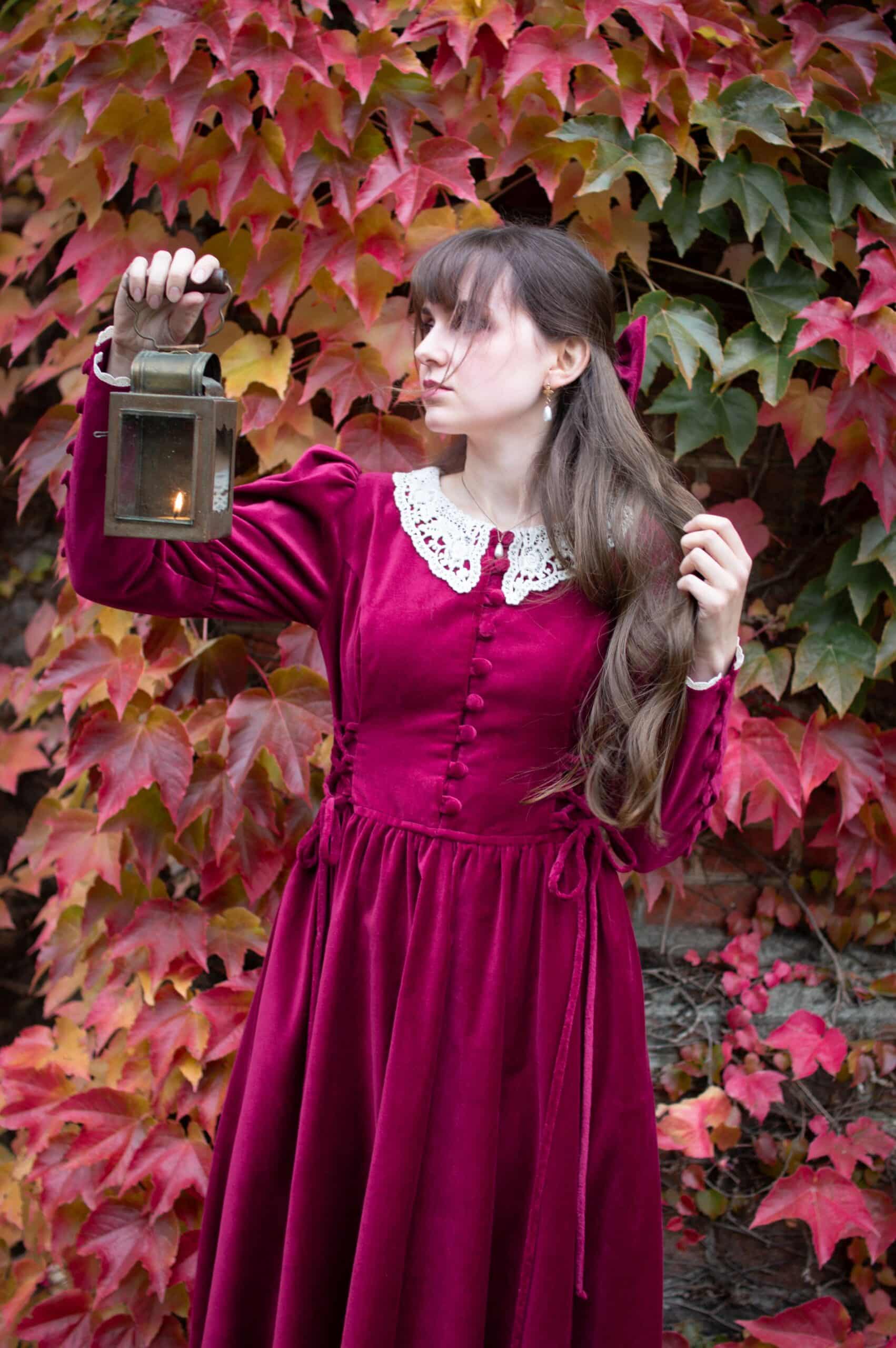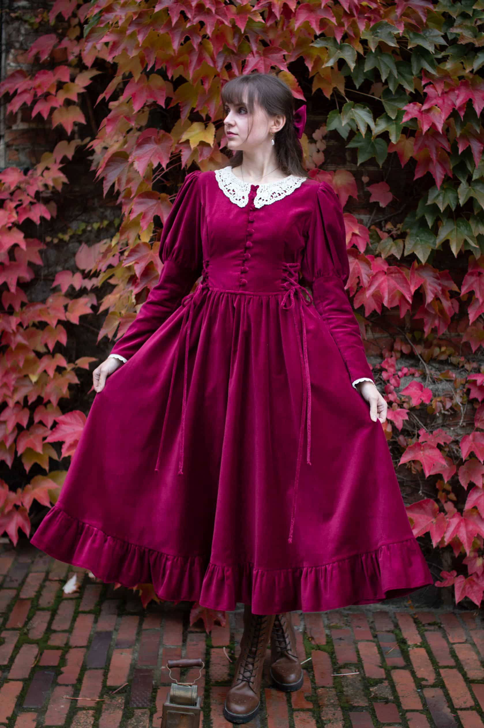 Scarlett is a vintage inspired midi dress made of rich burgundy cotton velvet. Full of eye catching details: delicate round neckline embellished with off white lace cotton collar, gathered waist adjustable with lacing on both sides, ruffle hem, long Juliet sleeves with button details and cotton lace trimmings. Scarlett has a side zipper and two side-seam pockets to fit your essentials. Close fitting bodice buttons up with hand covered buttons. Scarlett’s skirt is full and twirls beautifully when moving around.