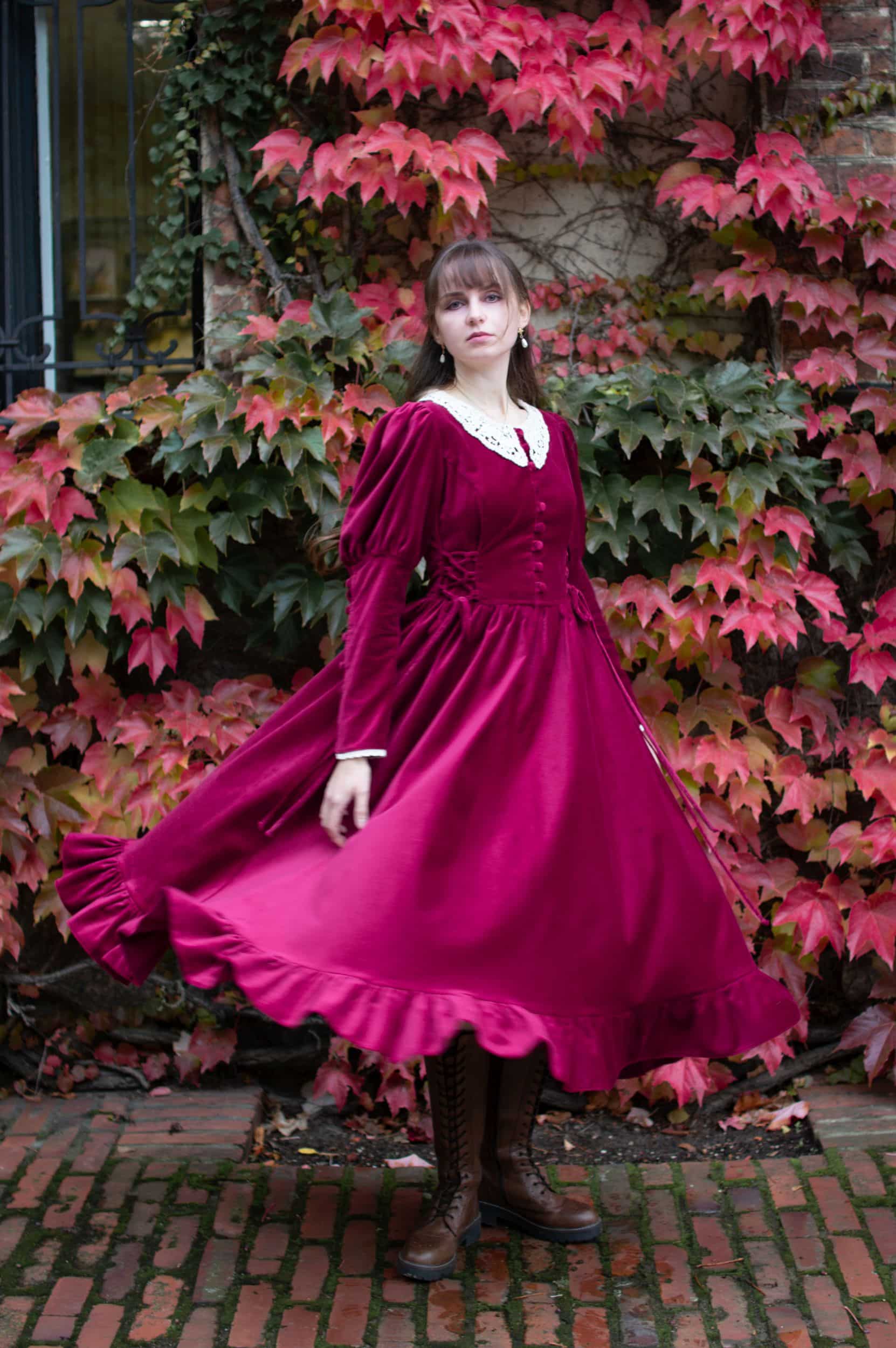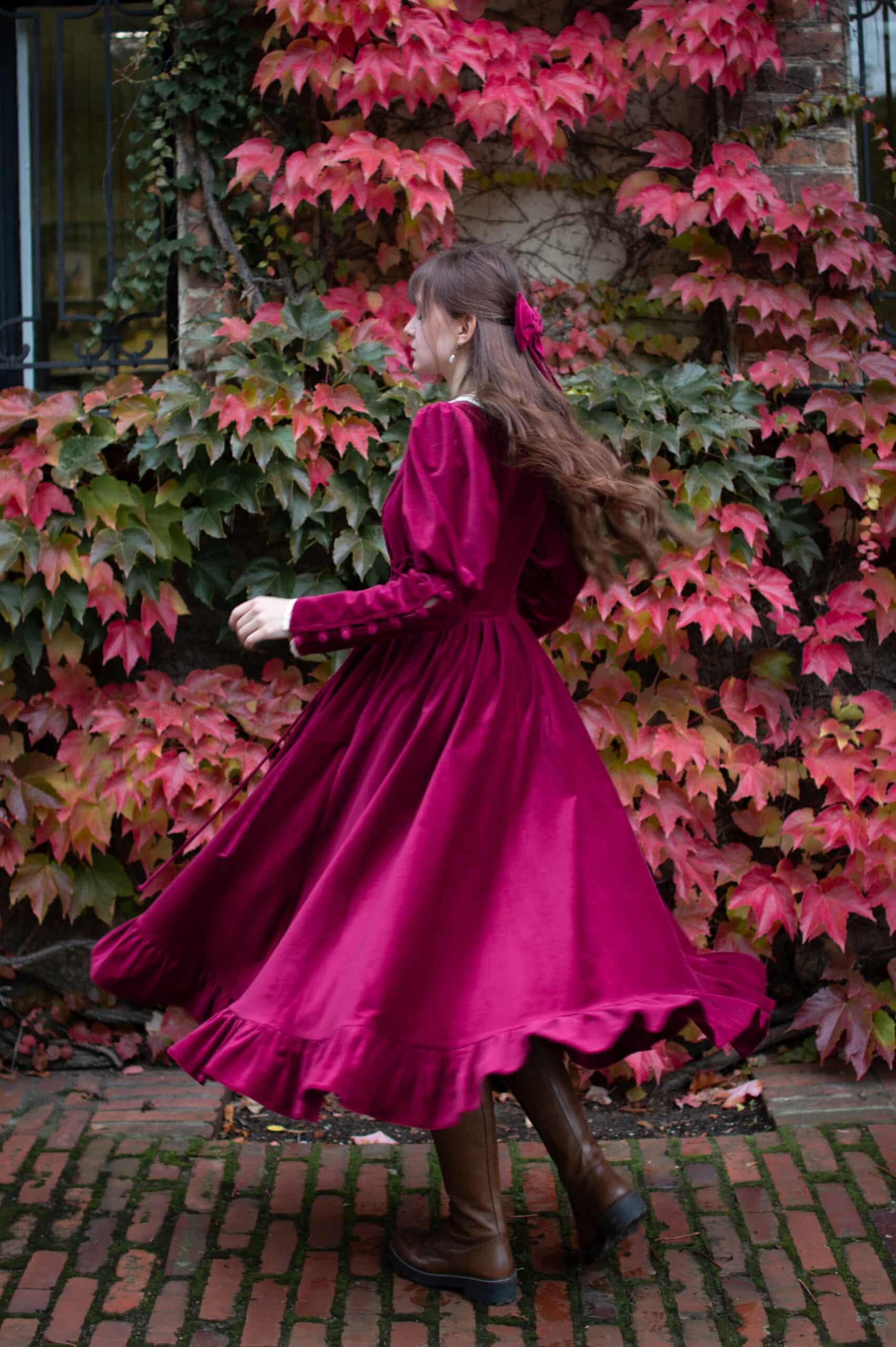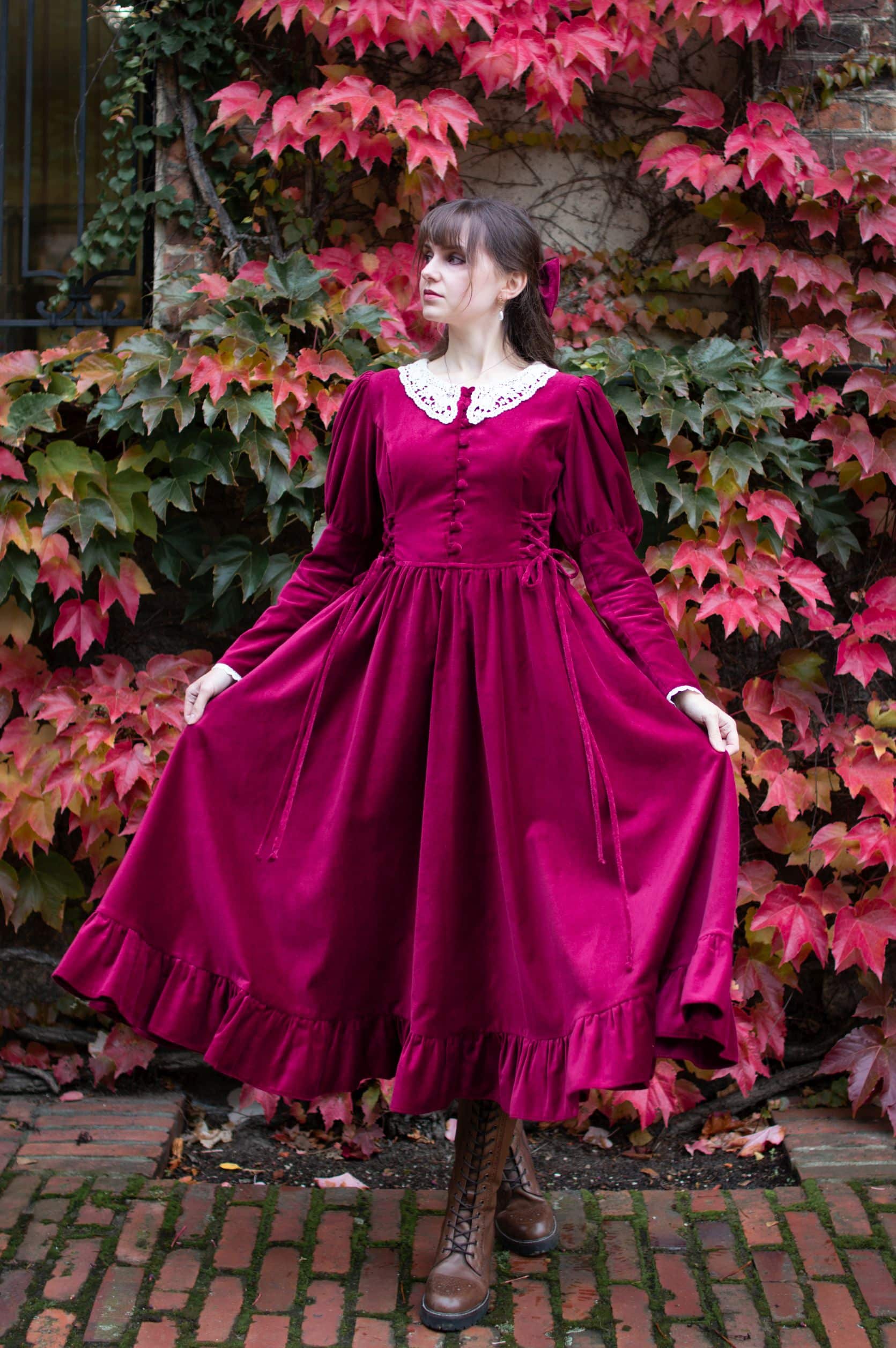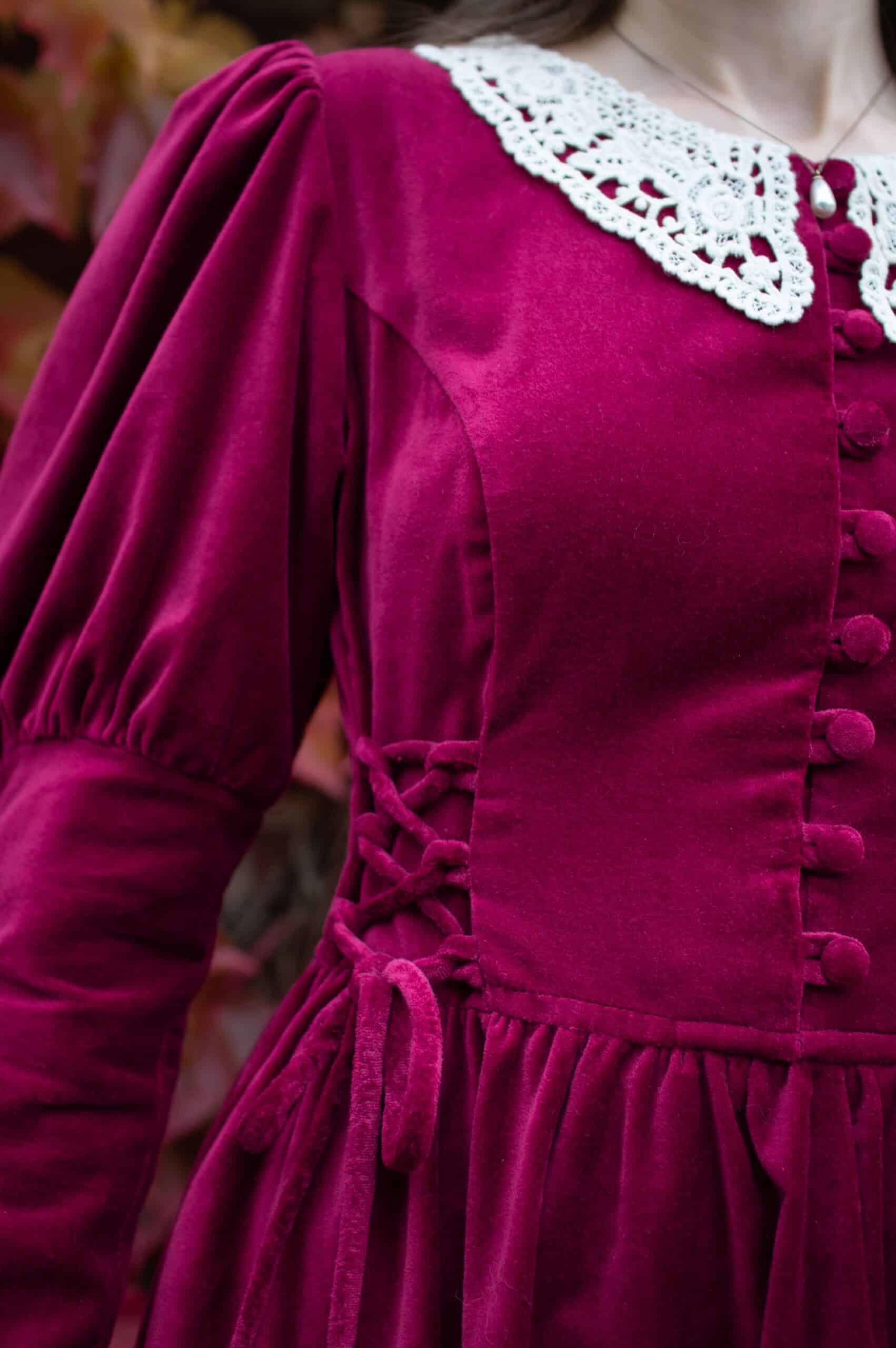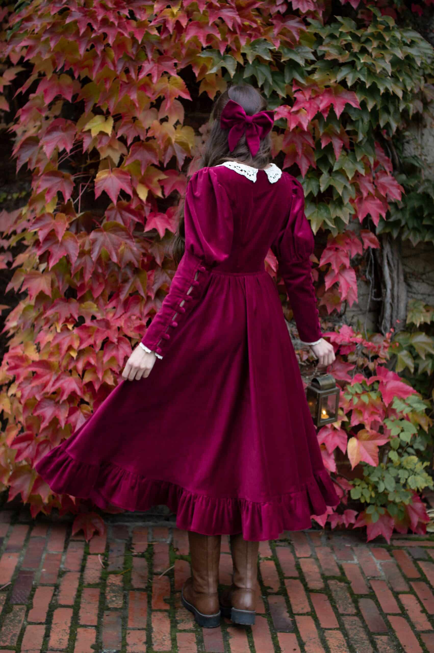 Scarlett is a vintage inspired midi dress made of rich burgundy cotton velvet. Full of eye catching details: delicate round neckline embellished with off white lace cotton collar, gathered waist adjustable with lacing on both sides, ruffle hem, long Juliet sleeves with button details and cotton lace trimmings. Scarlett has a side zipper and two side-seam pockets to fit your essentials. Close fitting bodice buttons up with hand covered buttons. Scarlett’s skirt is full and twirls beautifully when moving around.