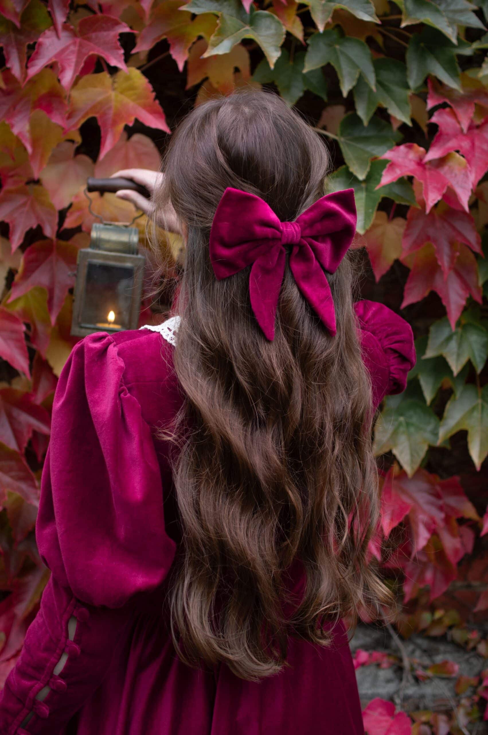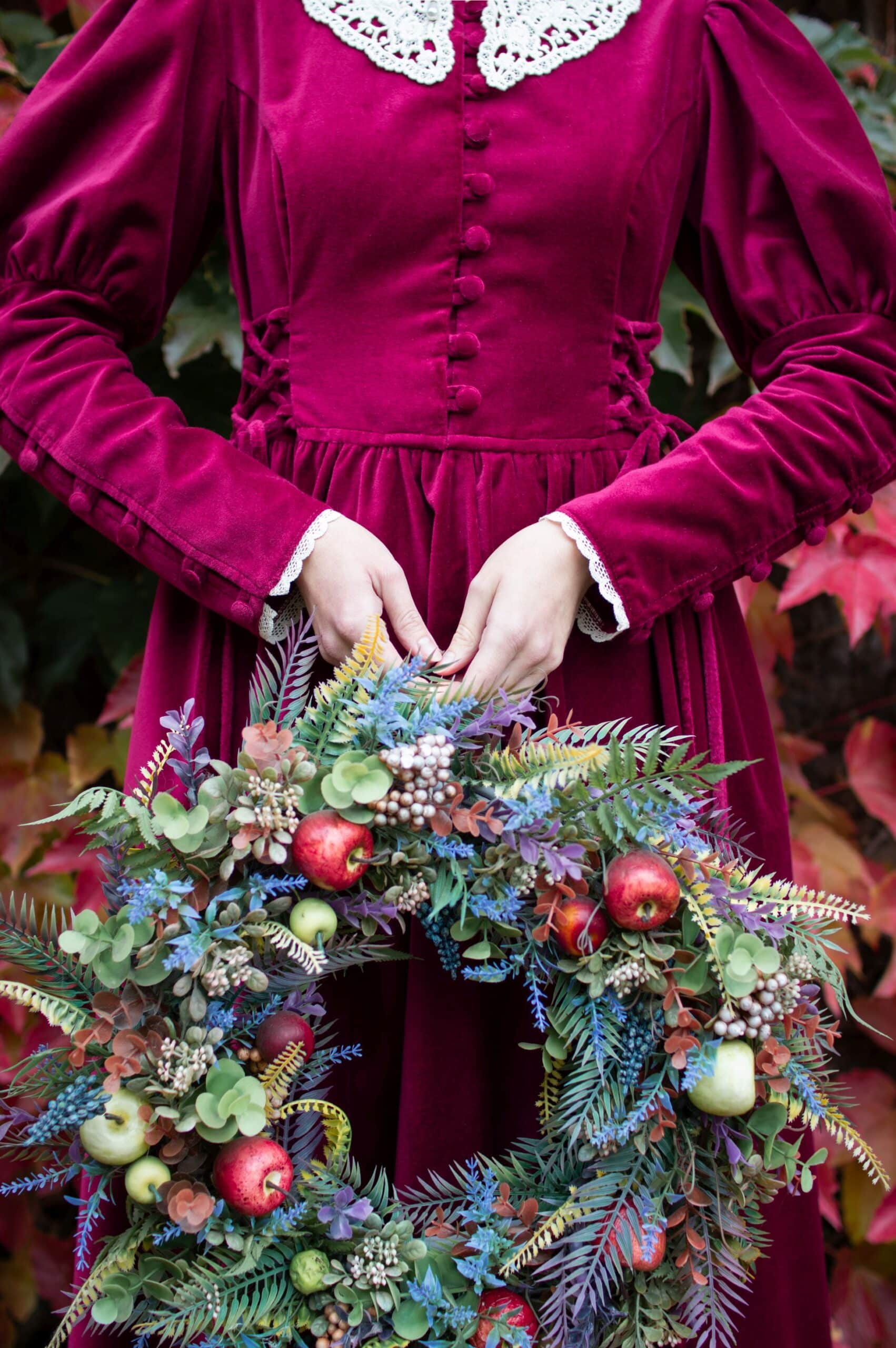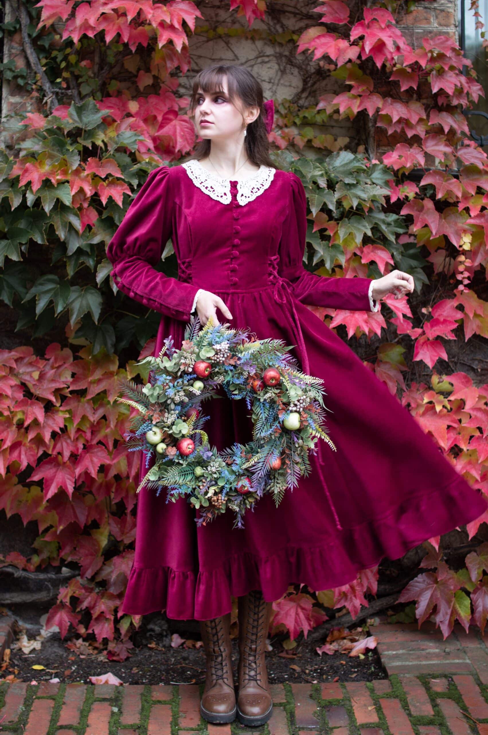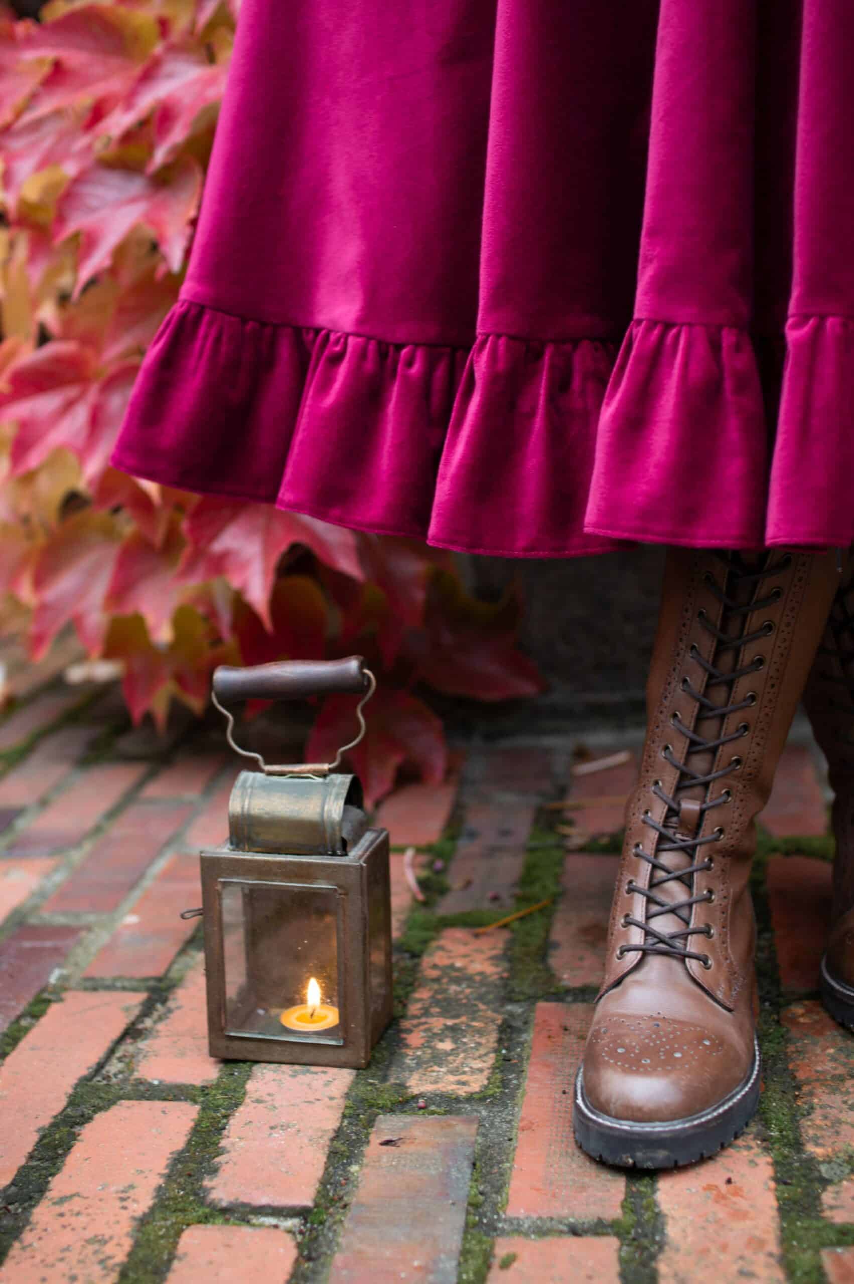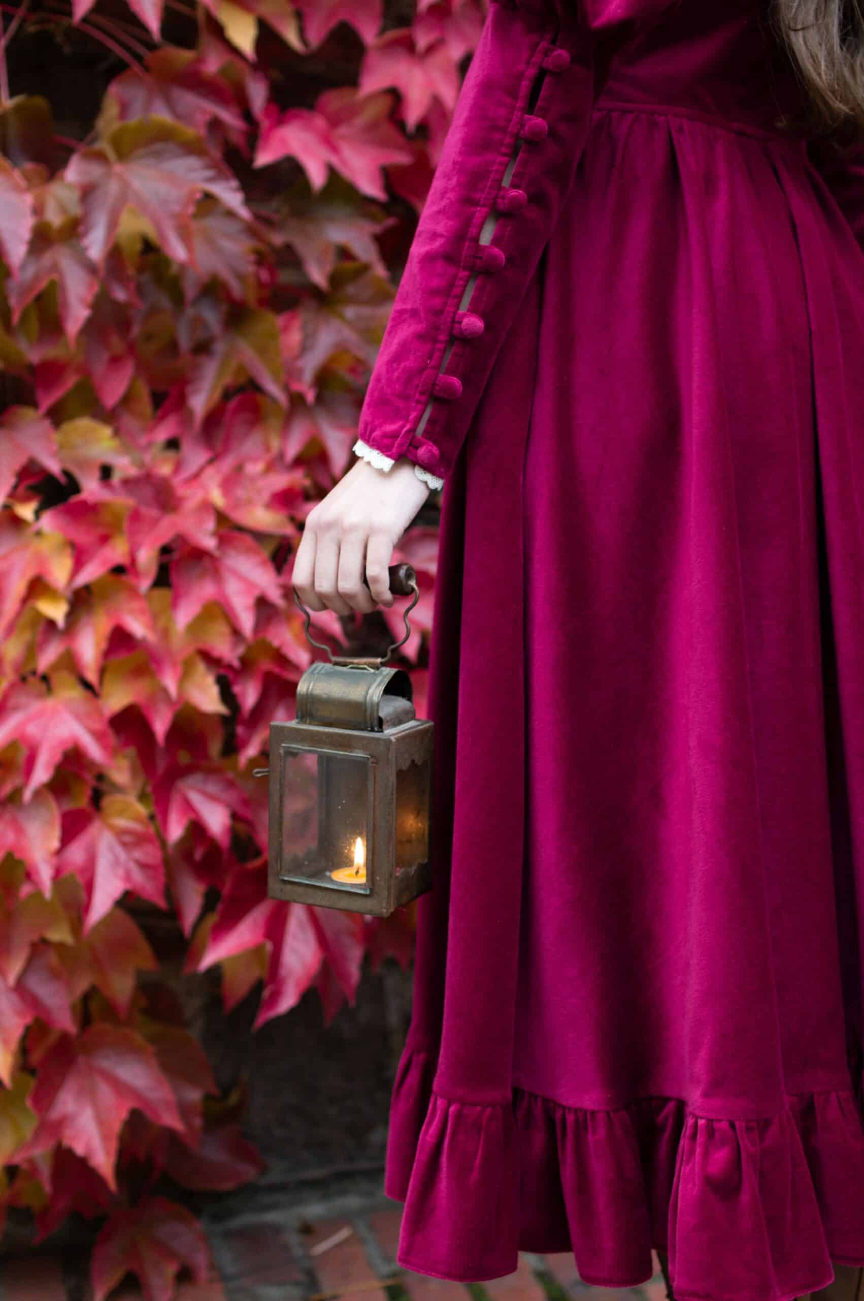 Scarlett is a vintage inspired midi dress made of rich burgundy cotton velvet. Full of eye catching details: delicate round neckline embellished with off white lace cotton collar, gathered waist adjustable with lacing on both sides, ruffle hem, long Juliet sleeves with button details and cotton lace trimmings. Scarlett has a side zipper and two side-seam pockets to fit your essentials. Close fitting bodice buttons up with hand covered buttons. Scarlett’s skirt is full and twirls beautifully when moving around.